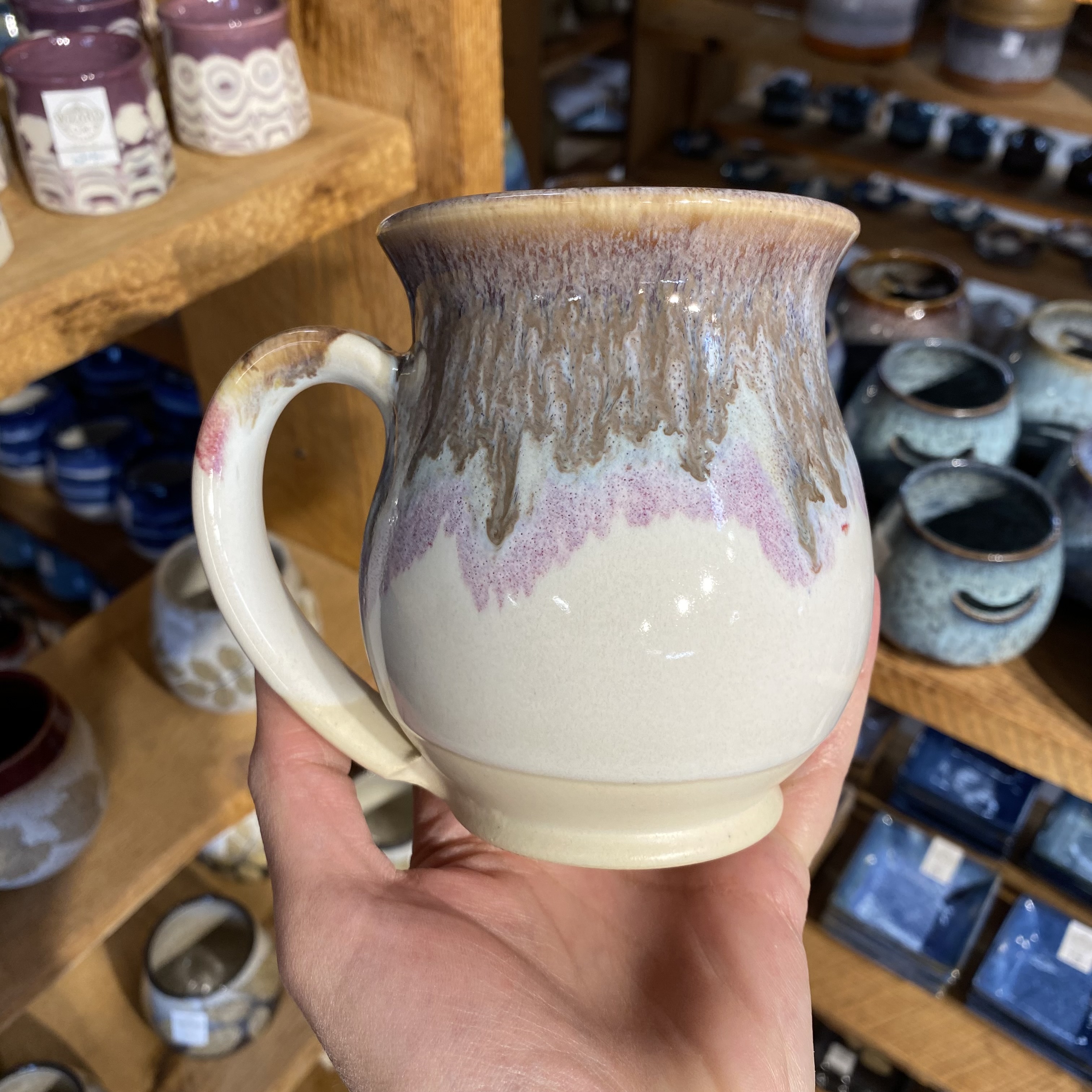 In honor of the original Wizards passing we decided to do a round of mugs in his favorite glaze combo. It is referred to as drippy chocolate covered cherry which starts with the drippy chocolate base, then we add the “cherry” to it. It best described as drips of brown with hints of teal in the middle and magenta at the ends of the drips. We can’t control the level of each color because the kiln is in charge of that aspect. Lead free and dishwasher, microwave, and oven safe, this mug holds approx. 12+ ounces and was made using our white clay. It is a super unique glaze and even prettier in person.