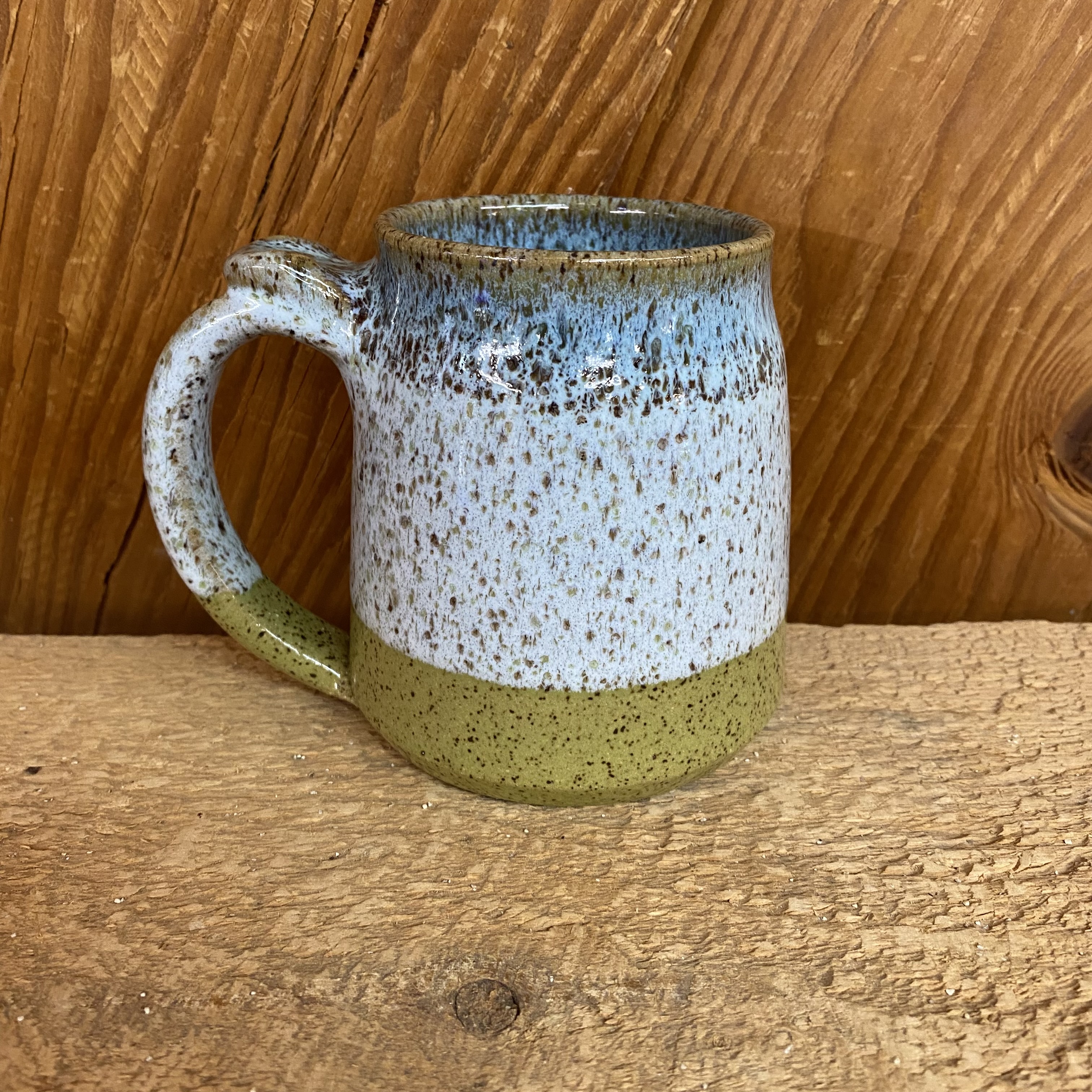One of our mugs but BIGGER! We also added an area on the handle for your thumb. Microwave, dishwasher, and oven safe. Each mug holds between 16-20+ oz. Glazed in shades of blue with hints of purple on a lime/pea green background. Need higher quantity? Call or email the store for availability of more.