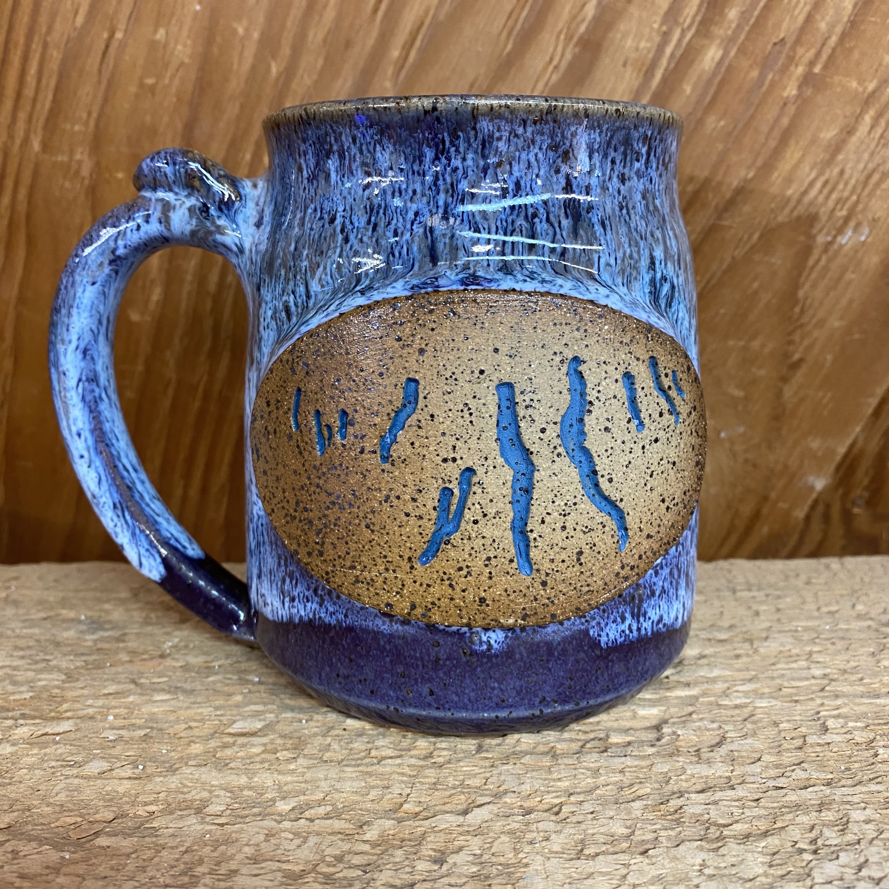 There is a lot of light glare on the photo. One of our tankard style mugs but even BIGGER! We had to make them bigger to fit the Finger Lakes. We also added an area on the handle for your thumb. Microwave, dishwasher, and oven safe. Each mug holds approx. 24 oz. and measures approx. 4 1/2″ tall. Glazed in shades of blue/ teal on a dark purple background. Glaze design may vary slightly from the one pictured.