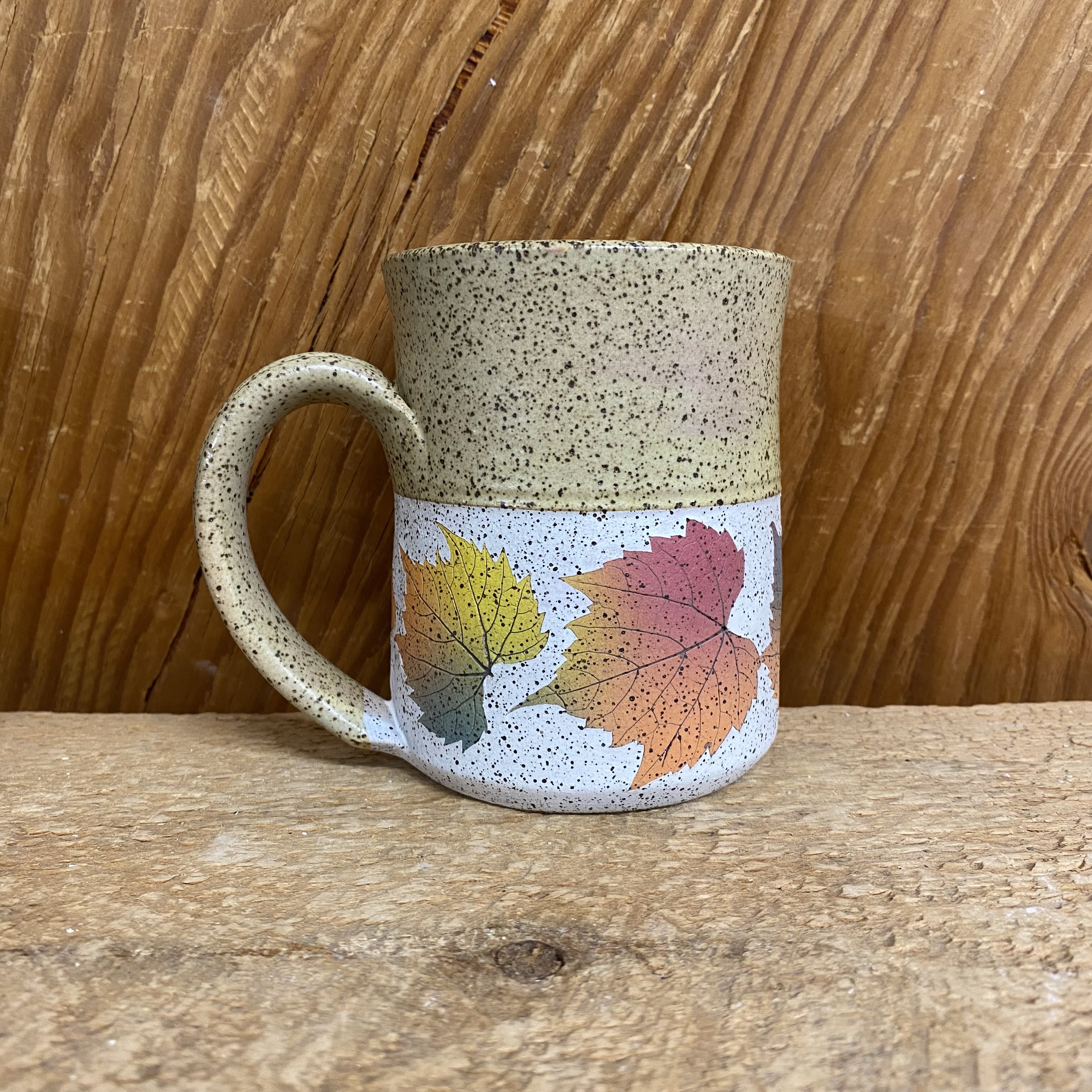 Lead free and microwave and dishwasher safe, this beautiful round mug holds 12 oz. of hot or cold beverage. Decorated with colored grape leaves on a white matte-style background, finished with tan glaze on the inside. Leaf placement and coloring design may vary slightly from the one in the picture.