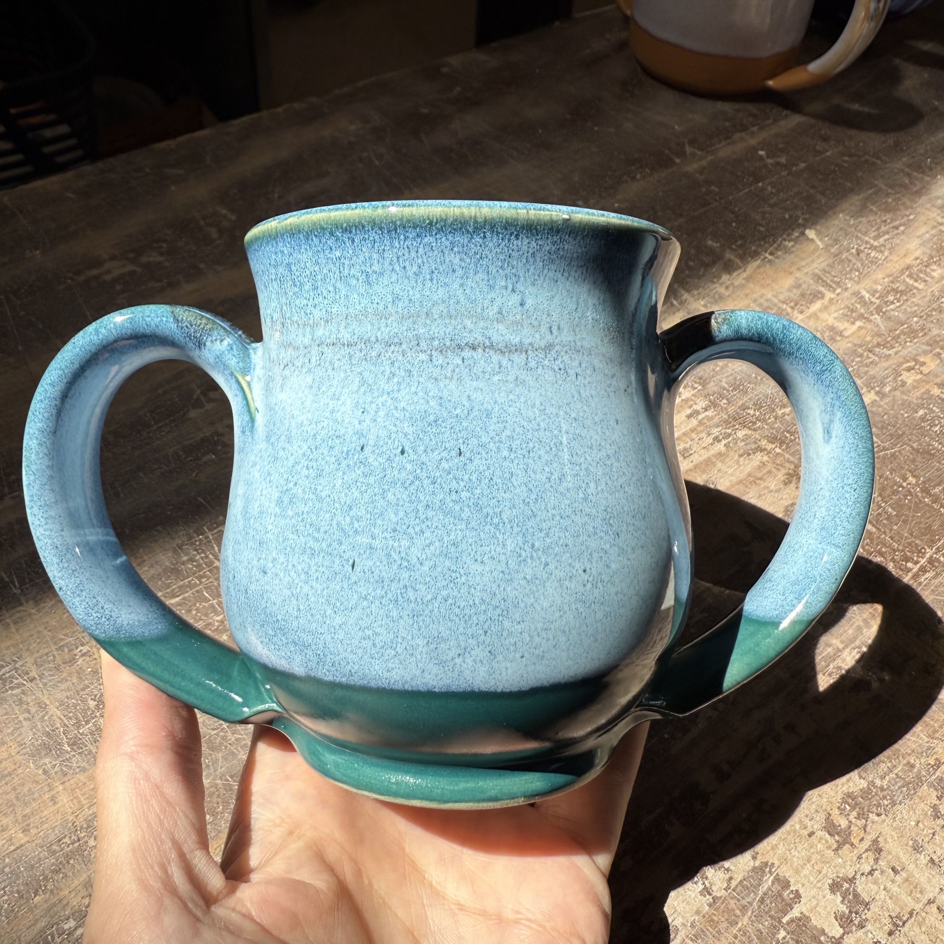 We call this our Arthritis Mug. It’s just like our regular mugs but with extra stability. Perfect for the person who needs that extra grip. Lead free, microwave and dishwasher safe, this beautiful mug holds 12+ oz. of hot or cold beverage. Glazed in blues with a deep, rich, dark green under-glaze . Glaze design may vary slightly from picture.