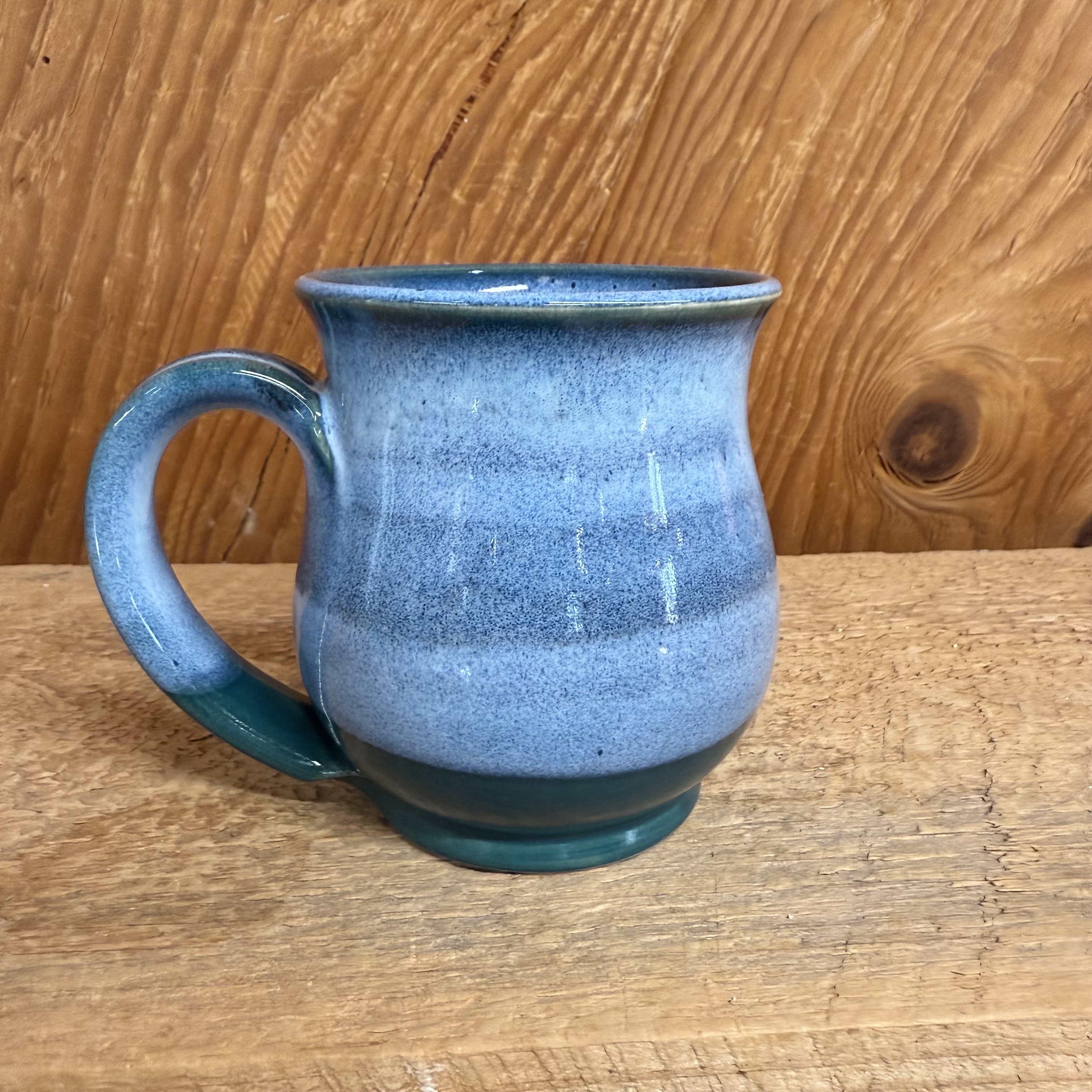 Microwave and dishwasher safe, this beautiful mug holds approx. 12+ oz. of hot or cold beverage. Glazed in shades of blue on a rich, deep green base color. Each one is hand-glazed, therefore, the glaze design may vary slightly from the one pictured.