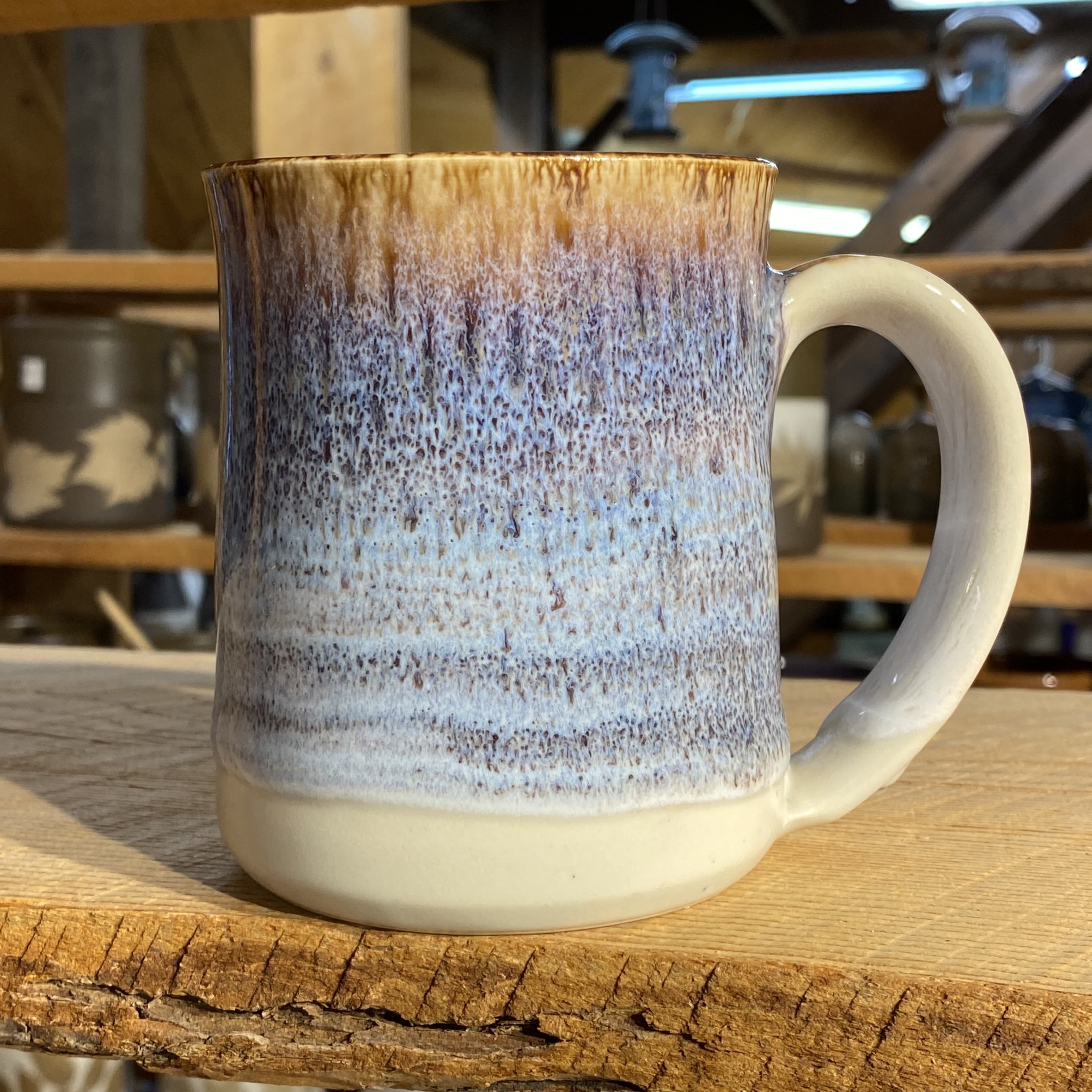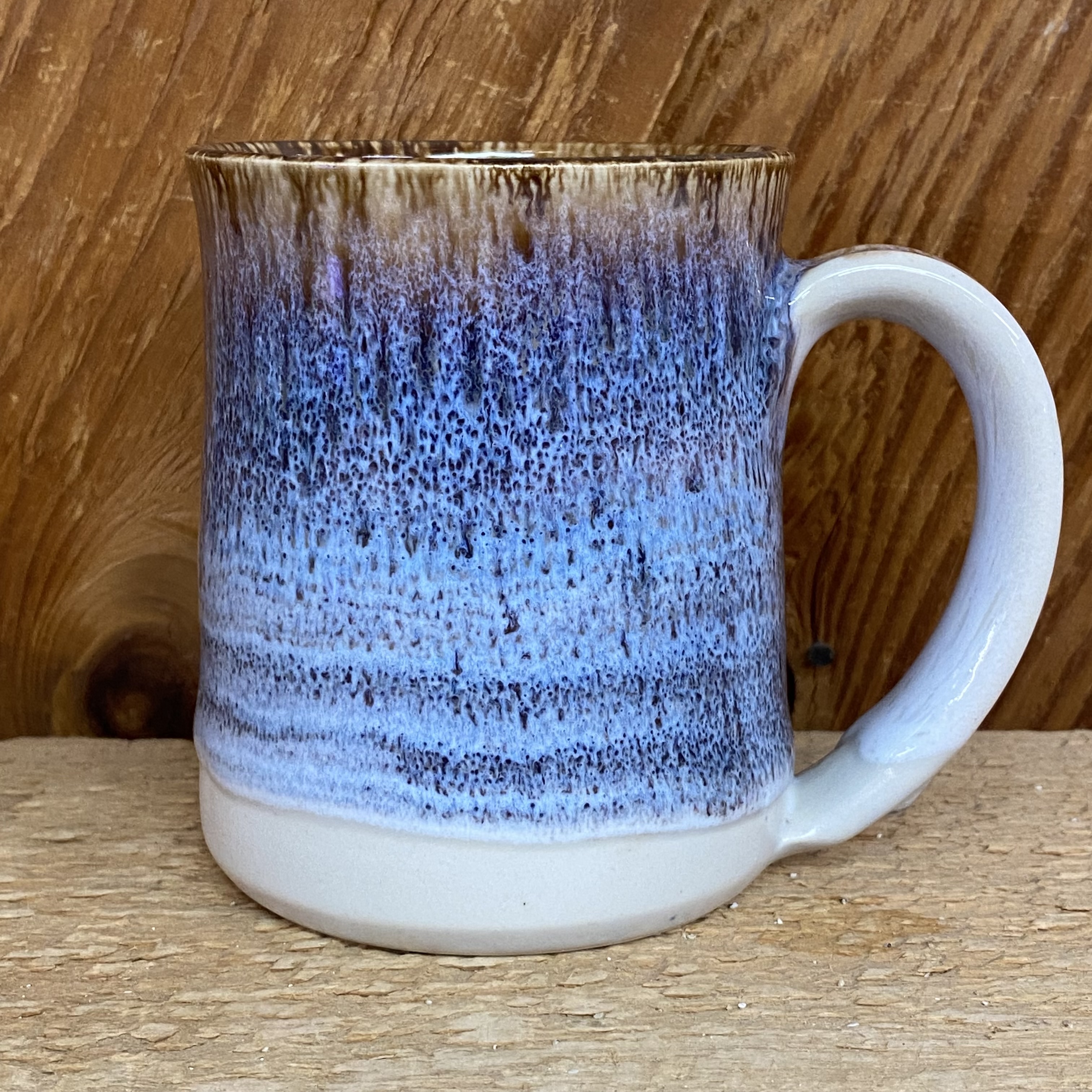 Microwave and dishwasher safe, this lead free beautiful mug holds 12+ oz. of hot or cold beverage. This glaze is difficult to describe… is it purple? or copper? It looks so different in different lighting so we took multiple pictures of the mug for you. The color is put over a white background on our white clay. Each one is hand glazed therefore, glaze design may vary slightly from the one pictured.