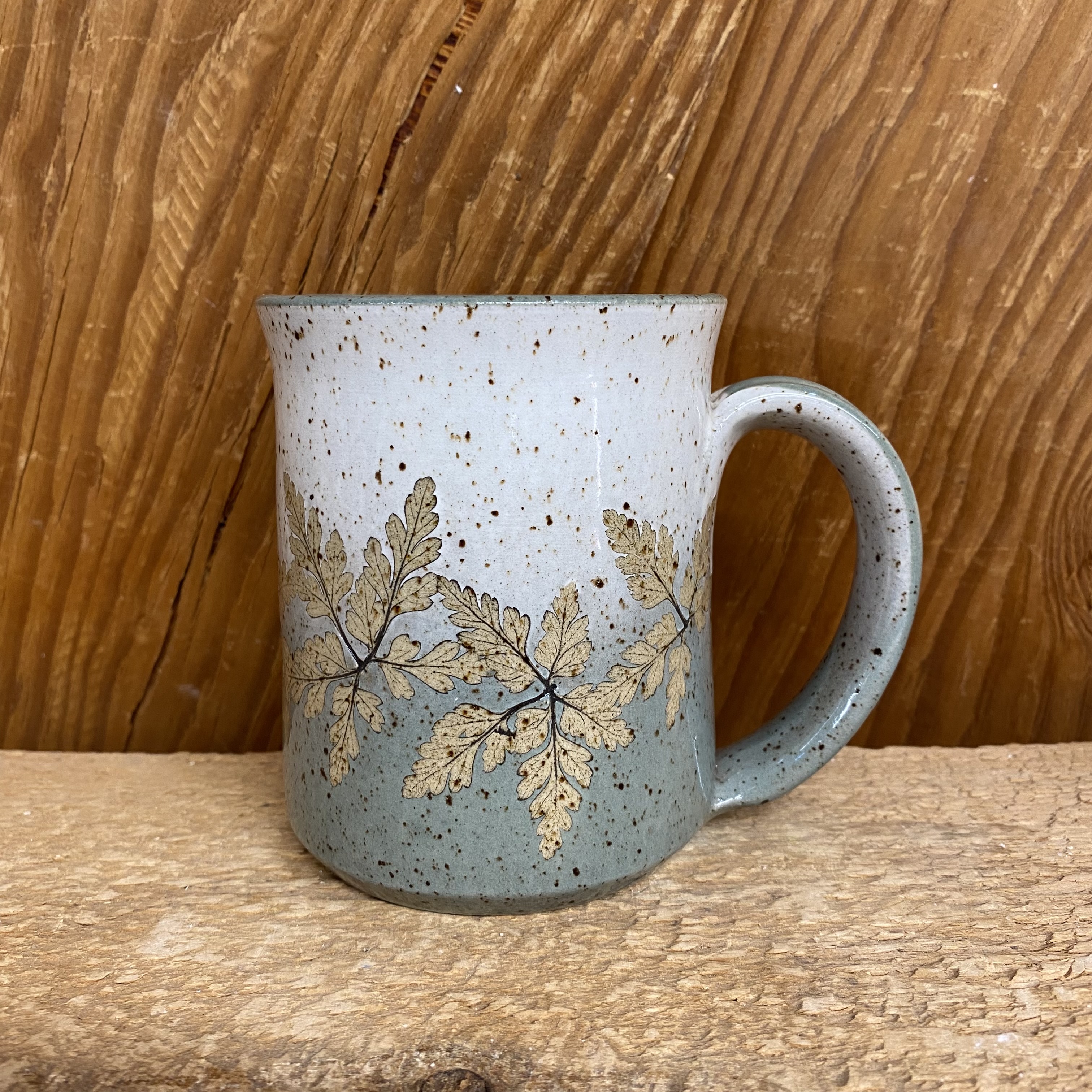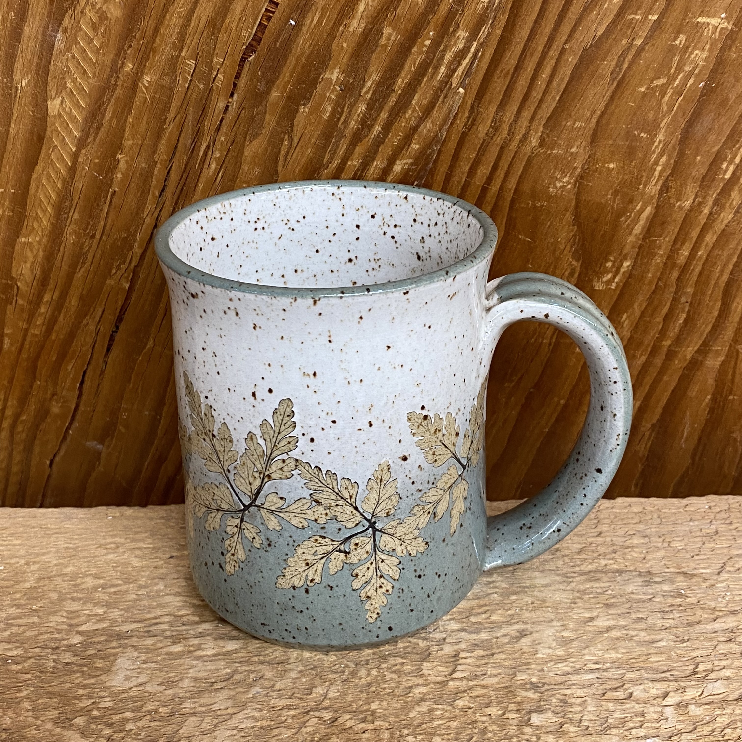 Microwave and dishwasher safe, this mug is great for hot or cold beverages. Holds approx. 12+ ounces. Decorated with tan wild geranium leaves on a white and green background, finished with a shiny glaze. Leaf placement & design may vary slightly from the one pictured.