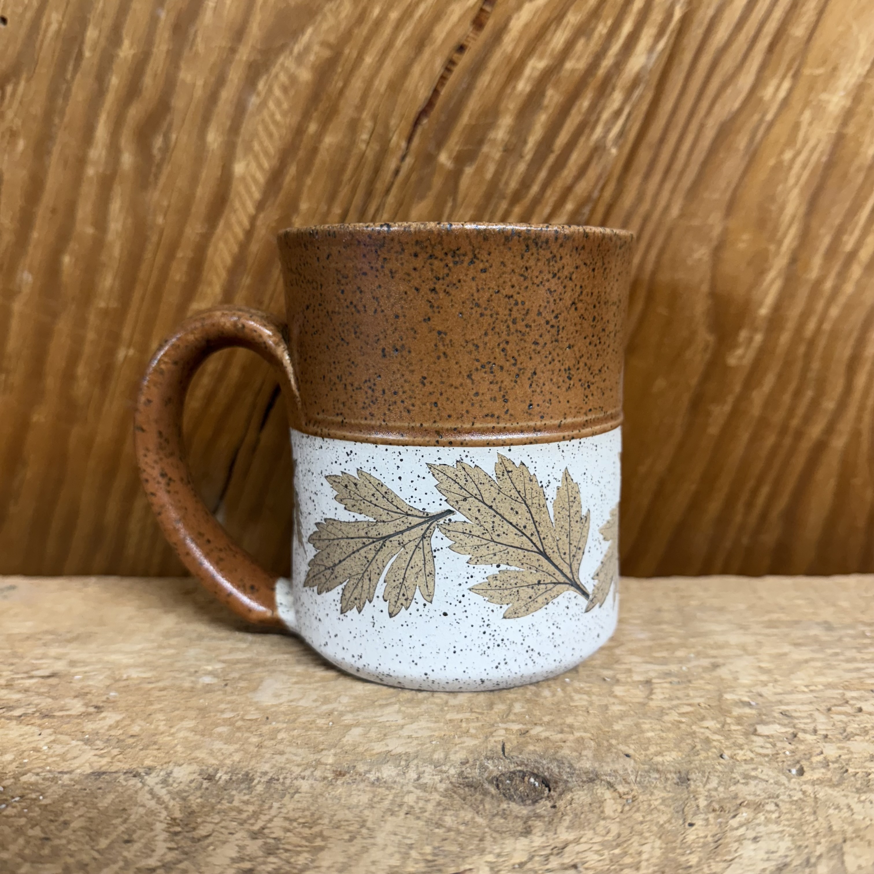 One of our classic Bristoleaf mugs. We use freshly picked leaves from the property each morning to make these. Microwave, oven, and dishwasher safe, this beautiful mug holds approx. 12 oz. of hot or cold beverage. Tan artemisia leaves on a white “matte-style” background, then finished with sienna/ burnt orange on the top and inside. Leaf placement and design may vary slightly from the one pictured.
