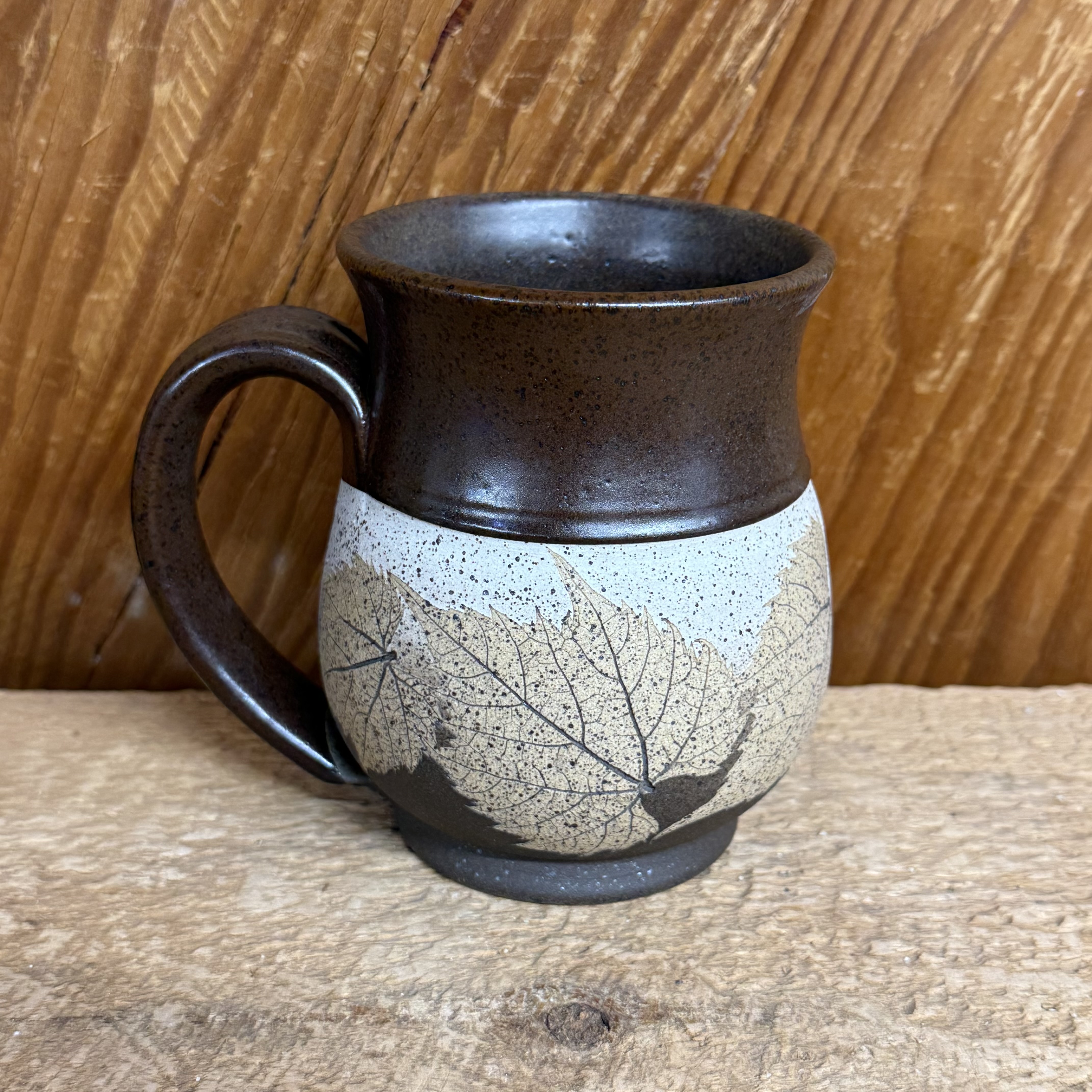 One of our classic Bristoleaf mugs. We use freshly picked leaves each morning to make these. Lead free and microwave, oven, and dishwasher safe, this beautiful mug holds approx. 12+ oz. of hot or cold beverage. These mugs have tan grape leaves on a white and brown “matte style” background finished with dark brown on the top and inside. Leaf placement and design may vary slightly from picture.