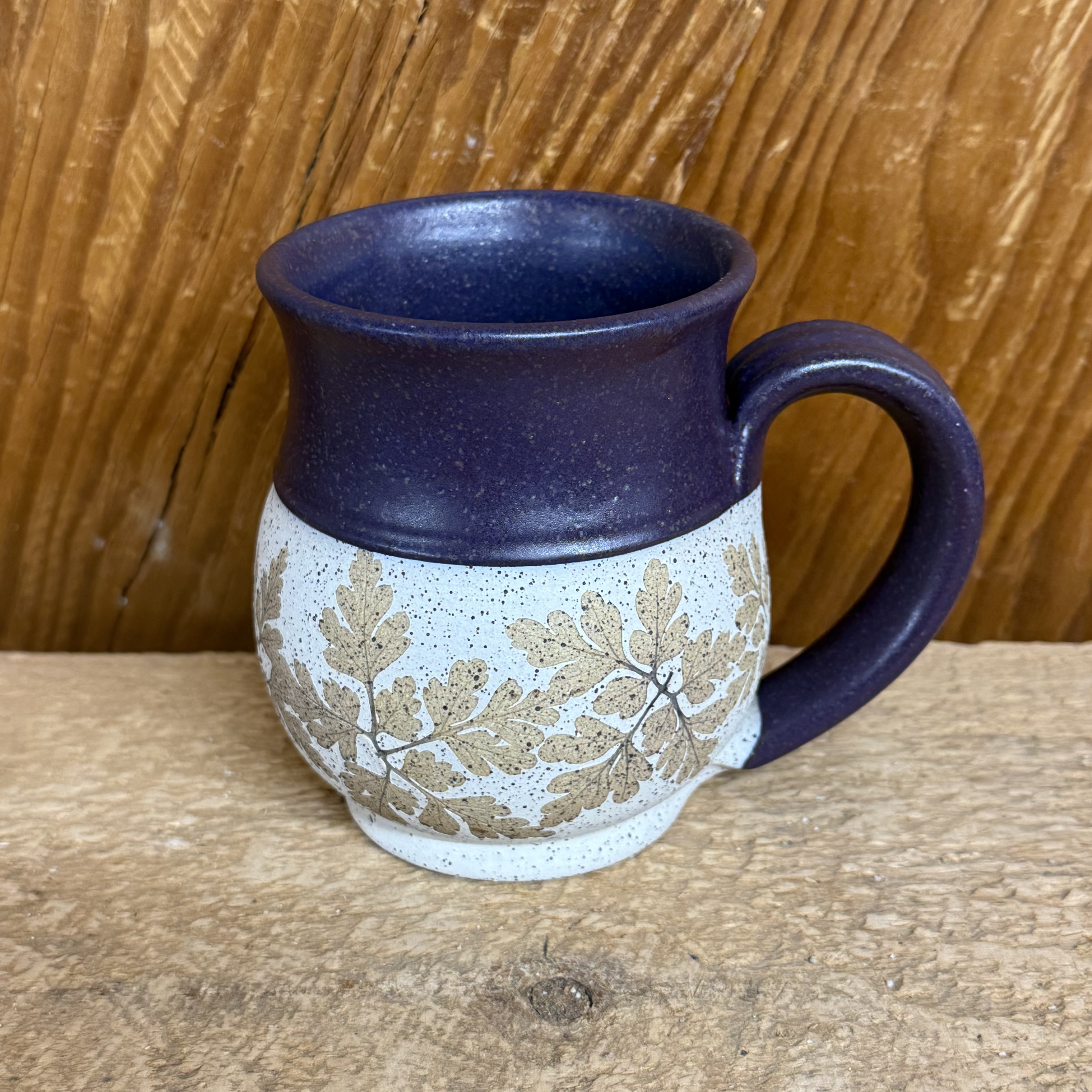 One of our classic Bristoleaf mugs. We use freshly picked leaves each morning to make these. Lead free and microwave, oven, and dishwasher safe, this beautiful mug holds approx. 12 oz. of hot or cold beverage. These mugs have tan geranium leaves on a white “matte-style” background then finished w/ a dark purple glaze at the top and inside. Leaf placement and design may vary slightly from picture.
