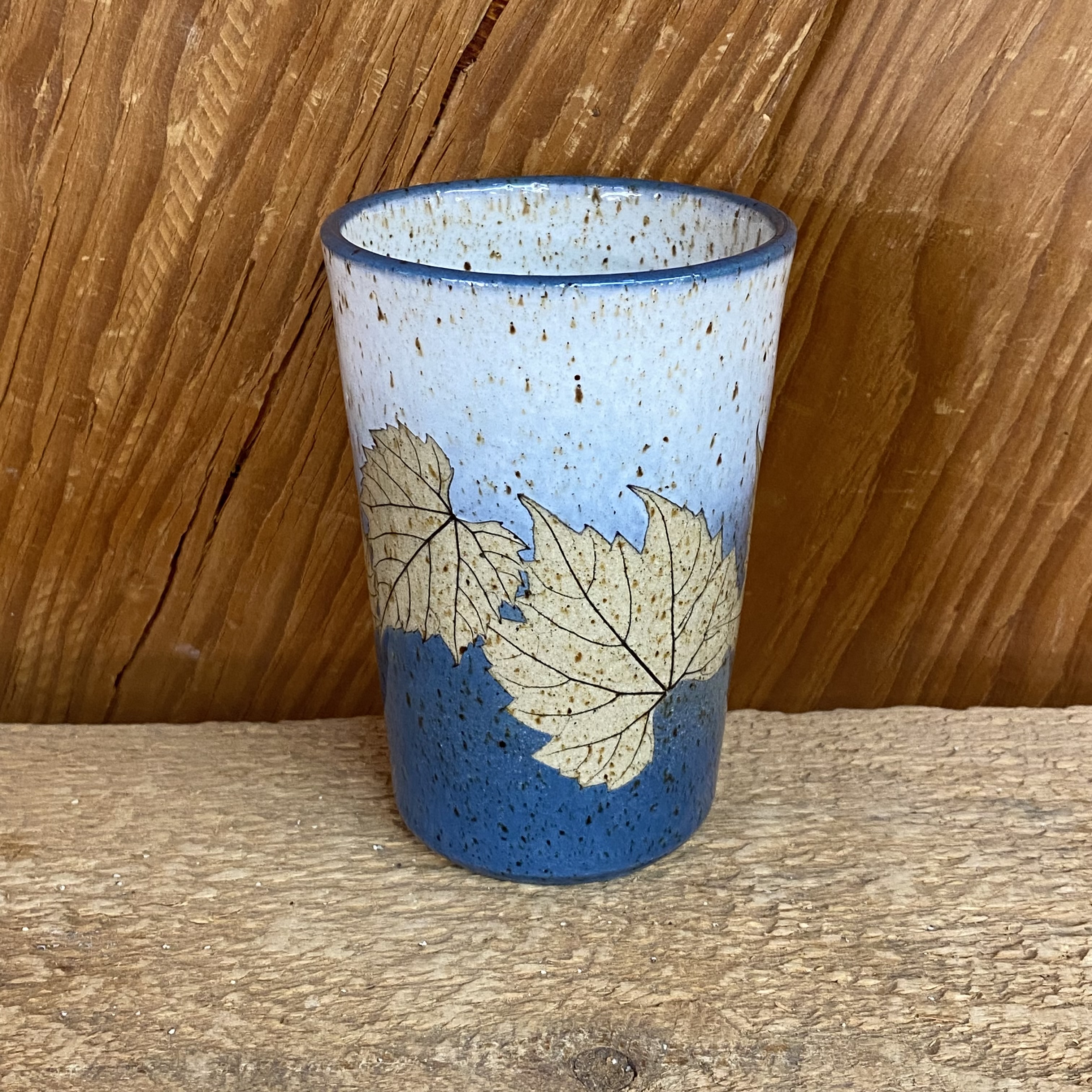We typically only make these once a year in a variety of sizes. This year we made 4 sizes and this is our medium-tall one. Glazed in blue and white with wild grape leaves, then finished with our shiny overglaze. Lead free, dishwasher, microwave & oven safe. These cups measure approx. 4 1/2+” tall and holds approx. 14 ounces. Great for all sorts of drinks. Mojitos are one of our favorites in this cup. Plenty of room for muddling. Leaf placement may vary slightly from the one pictured.