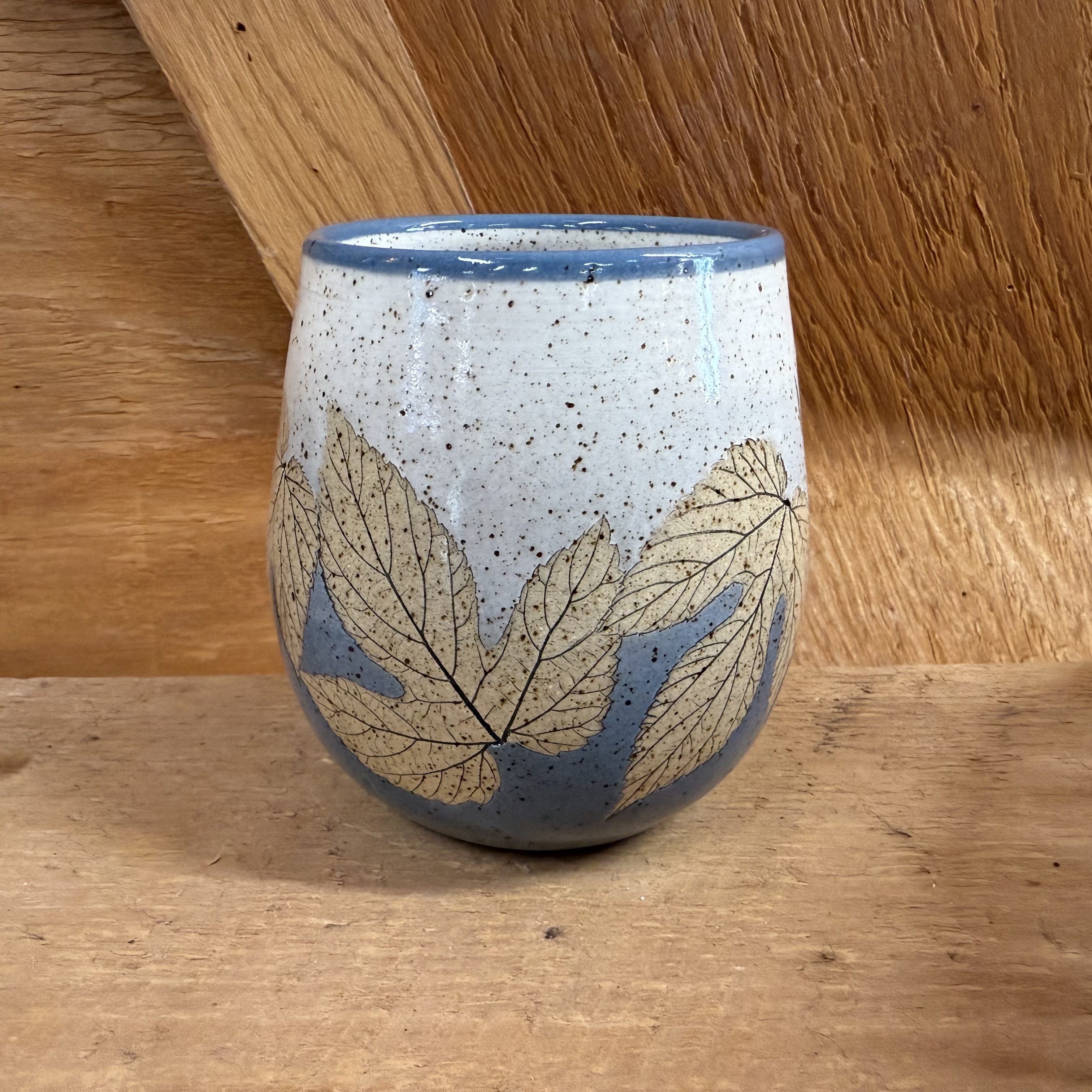 Why run the risk of knocking your wine over? We made these Bristoleaf cups just for you! We call them stemless wine glasses but they are great for tea, milk, or anything else you drink. Each cup is approx. 4″ tall and holds approx. 14+ ounces. Microwave, dishwasher, and oven safe. These have tan hop leaves with a blue and white background. Leaf placement may vary slightly from the one in the picture.