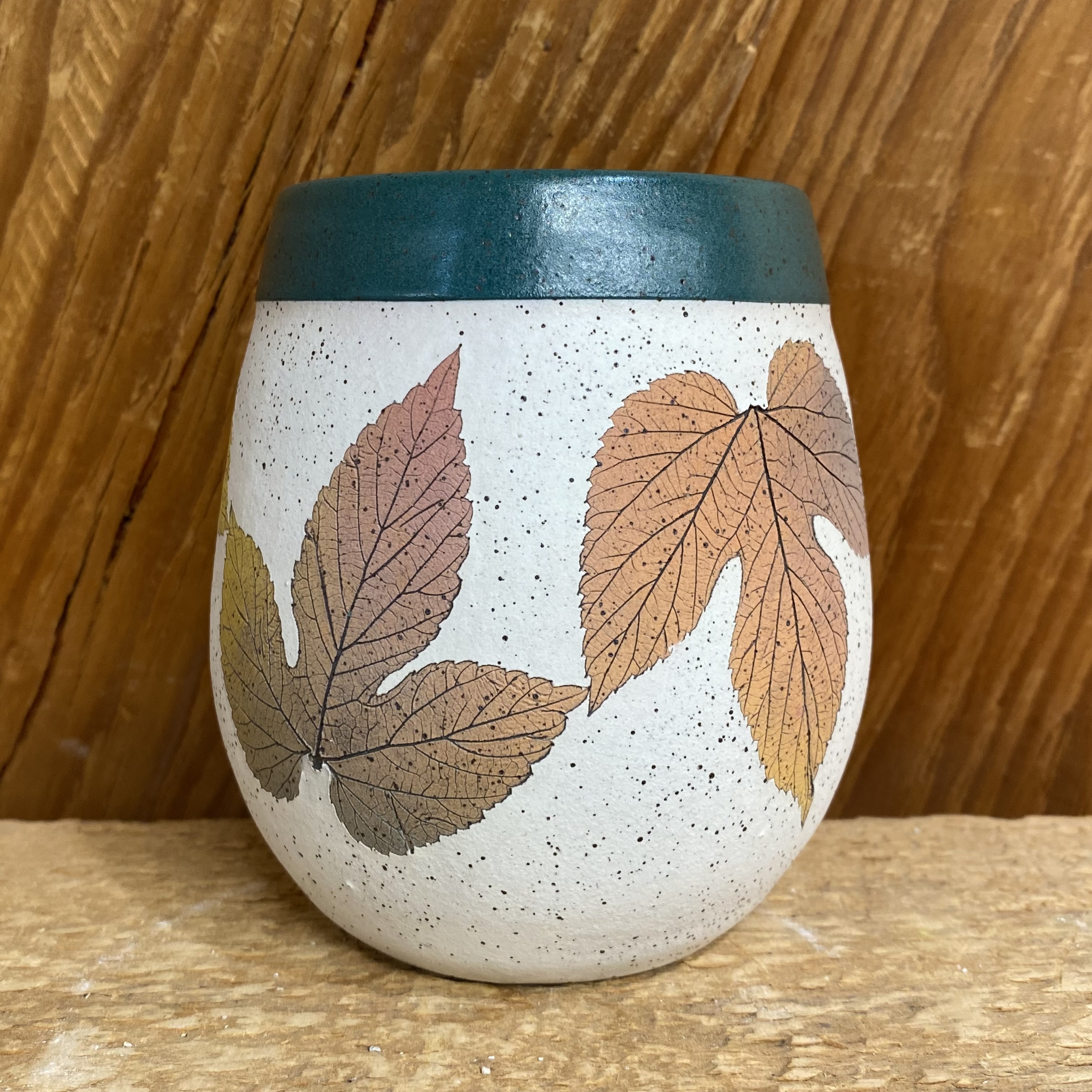 Why run the risk of knocking your wine over? We made these just for you! We call them stemless wine glasses but they are great for tea, milk, or anything else you drink. Each cup is approx. 4″ tall and holds 16+ ounces. Microwave, dishwasher, and oven safe. Each has colored beer hop leaves on our classic white “matte-like” background, then glazed a beautiful green around the rim and inside. Coloring of leaf and placement design may vary slightly from the one in the picture.