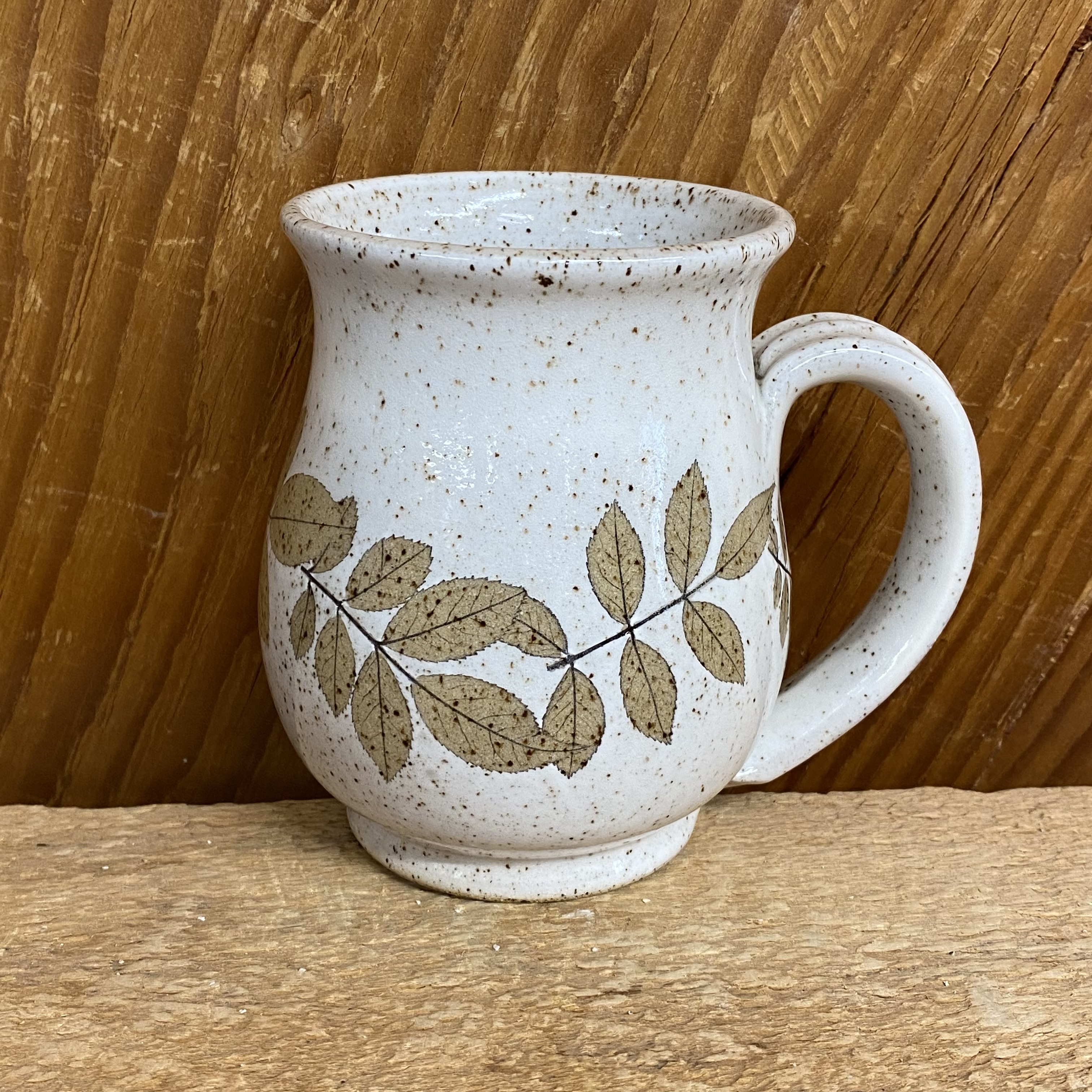 Microwave and dishwasher safe, this mug is great for hot or cold beverages. Holds about 12+ ounces. Decorated with tan wild rose leaves on a white shiny background. Leaf placement & glaze design may vary slightly from the one pictured. All of our pottery is lead free.