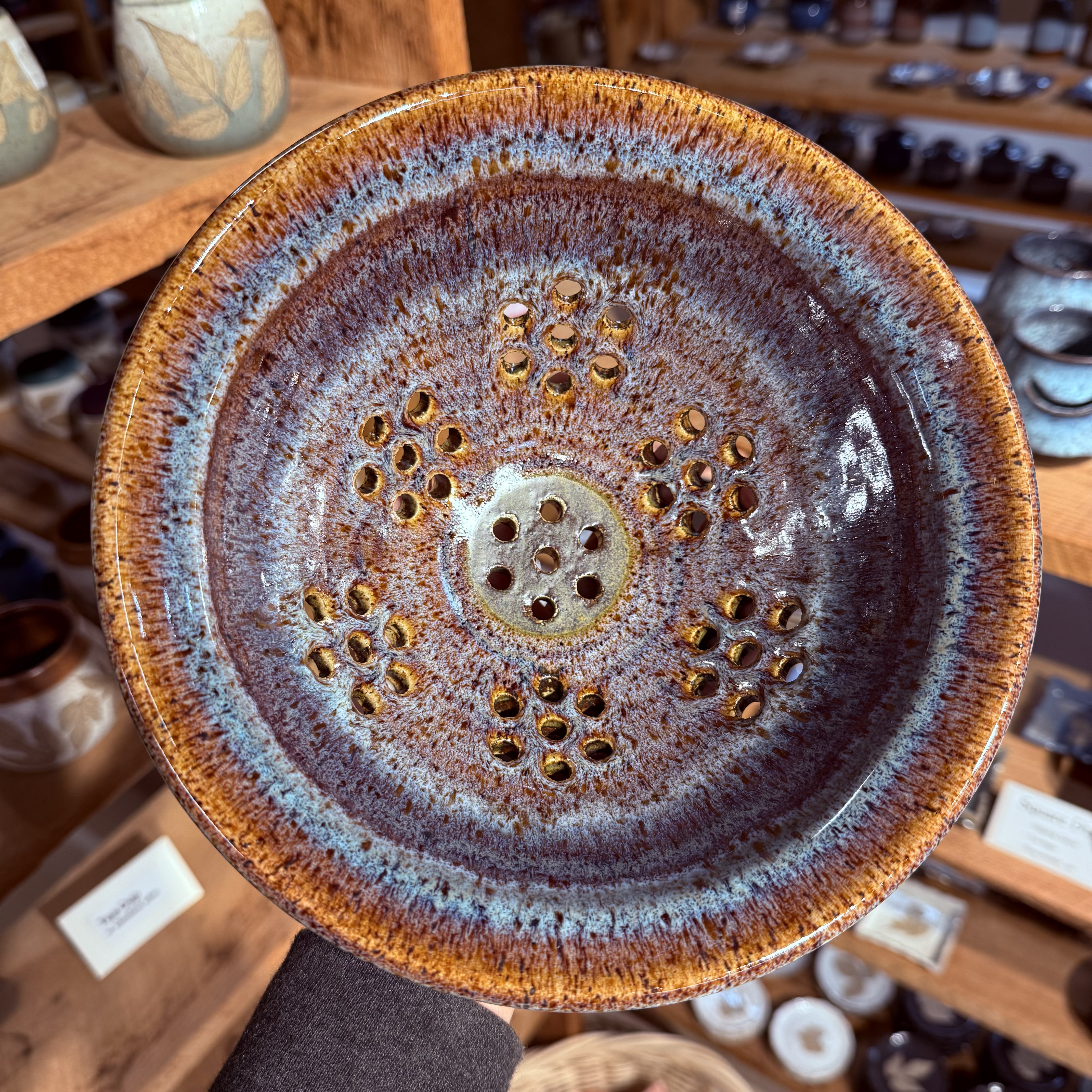 One of our most popular items – a berry bowl! Wash and drain your favorite berries, grapes or any fruit picked fresh from your garden in this beautiful bowl. Bowl has drainage holes at the bottom. Two piece set – comes with berry bowl and drip plate. Dishwasher safe. Bowl measures approximately 8″ x 4″, plate measures approximately 6 1/2″ round. This glaze is hard to describe. It is shades of blue/ teal with hints of green and purple on a brown underglaze. Glaze design may look slightly different than the one in the picture.