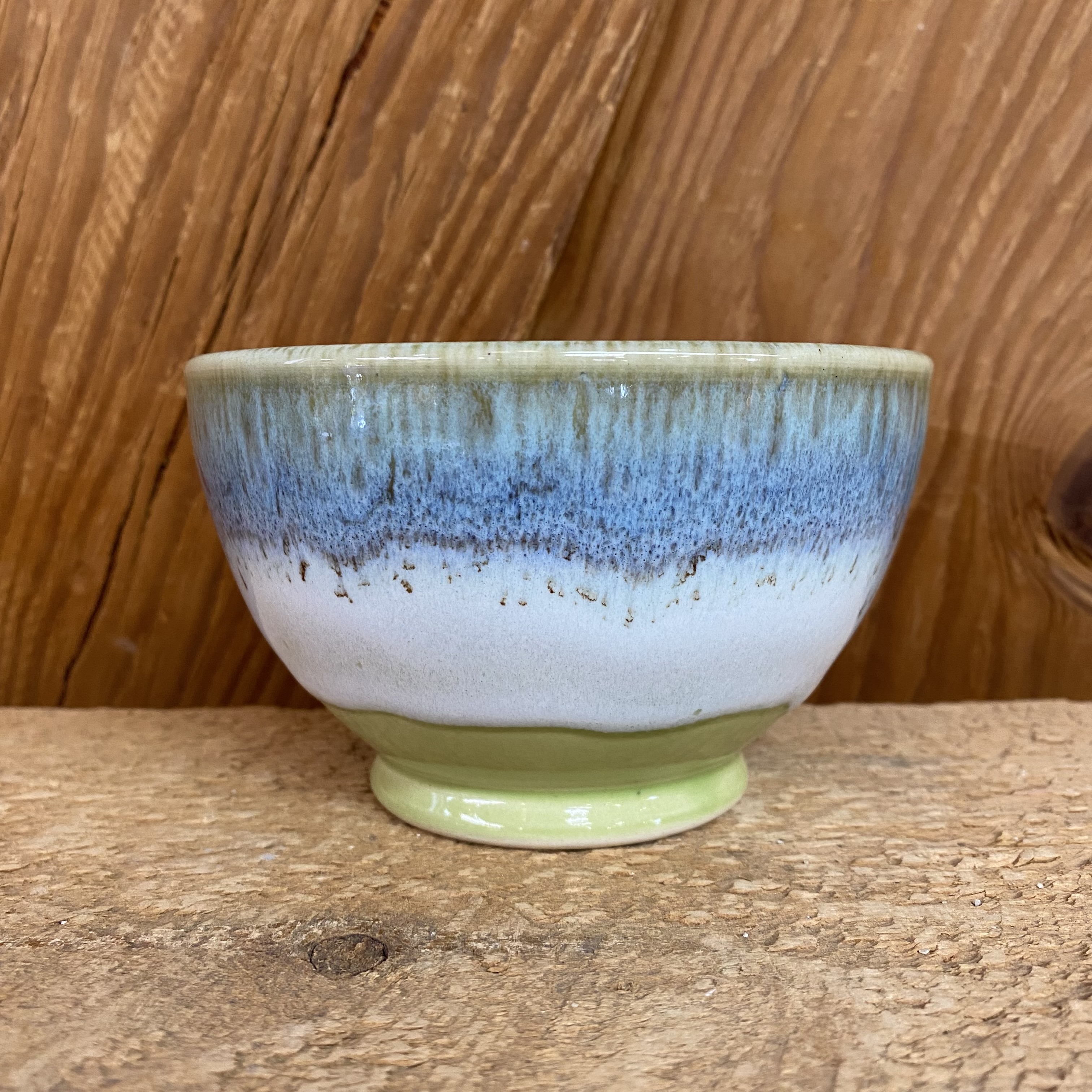 This beautiful bowl is just right for cereal or salsa! Measures approximately 3″ (h) x 5″. (d) Glazed in shades of frosty blue with hints of purple on a lime green base glaze. Each one is hand glazed, therefore, glaze design may vary slightly from the one pictured. Lead free, microwave, oven, & dishwasher safe.