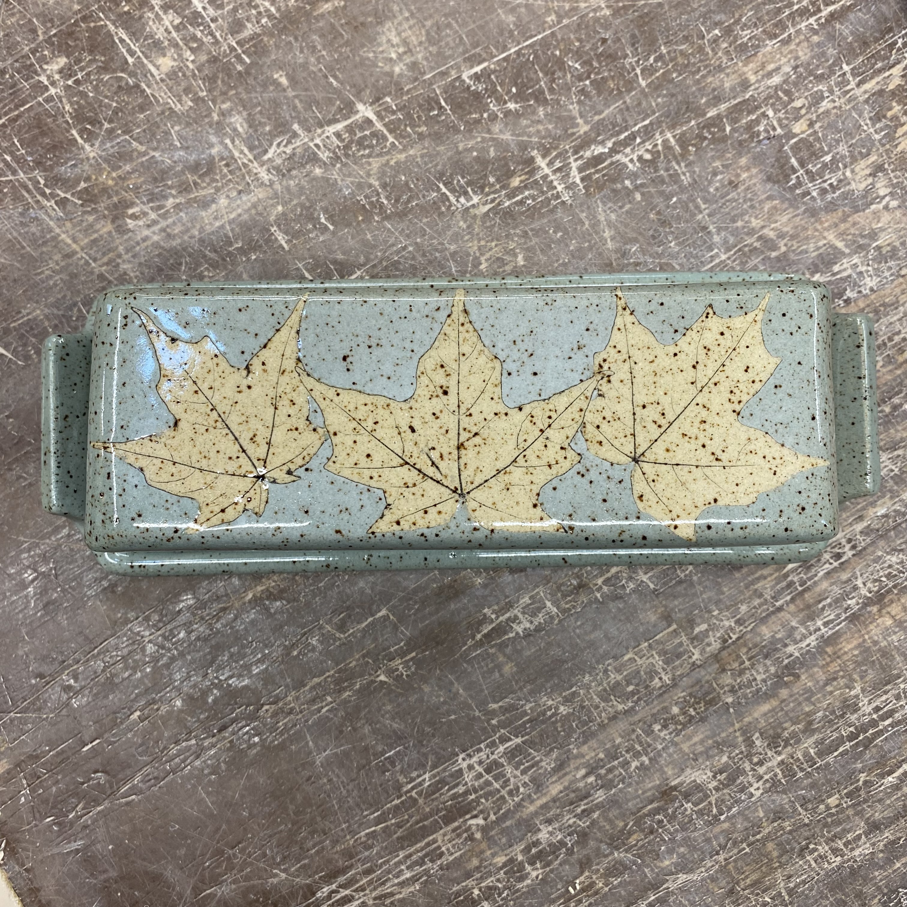 Take your butter from the fridge to the table in this lovely butter dish. Holds one stick of butter (7″ x 3″). Glazed in green with red maple leaves. Dishwasher safe. Leaf design may vary slightly from the one in the picture. NOTE: there is some glare on the picture from the store lights.