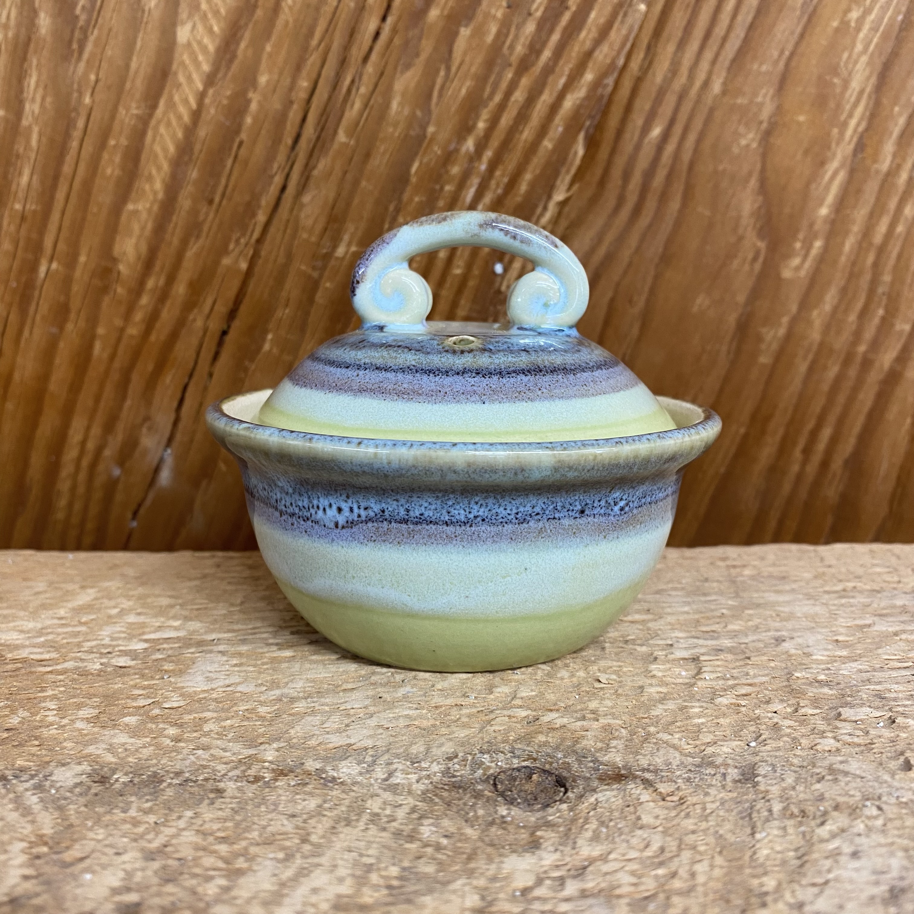This cute 2 piece egg poacher works in your microwave. Spray bowl with oil/ butter (optional). Crack egg into bowl and pierce yolk with a knife to release steam during cooking. Lid comes with vent hole. Just 30 seconds, and voila! Glazed with frosty blue with hints of purple on a lime green base. As always, use care when handling hot objects. Glaze design may vary slightly from the one in the picture.