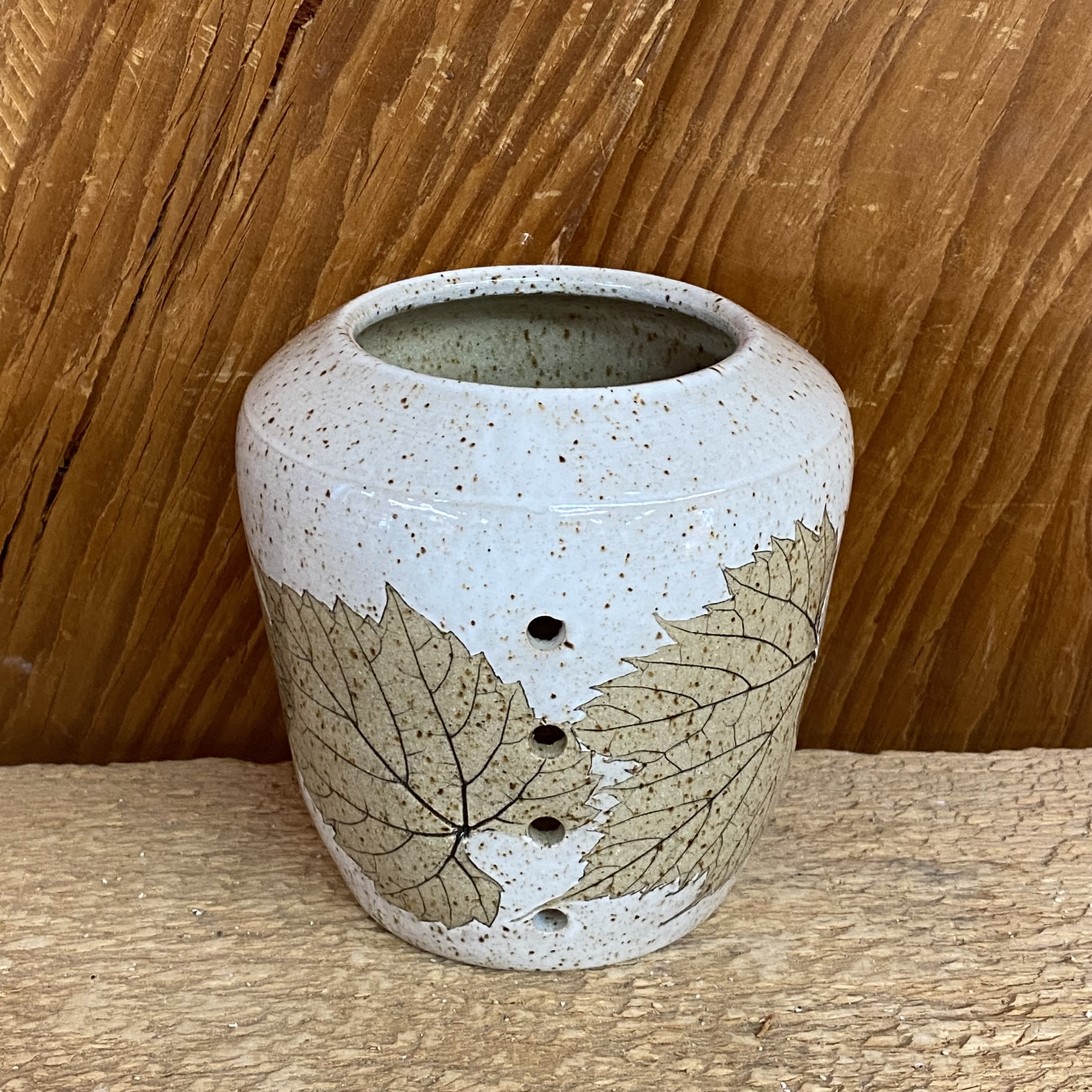 The air vents keeps our garlic jar ventilated, which keep the garlic cool and dry. While the lid protects the garlic from light for a longer shelf life and prevents sprouting. Decorated with tan wild grape leaves on a white background and a shiny finish. Measures approximately 4 1/2″ h x 4″. Leaf placement and design may vary slightly from the one pictured.