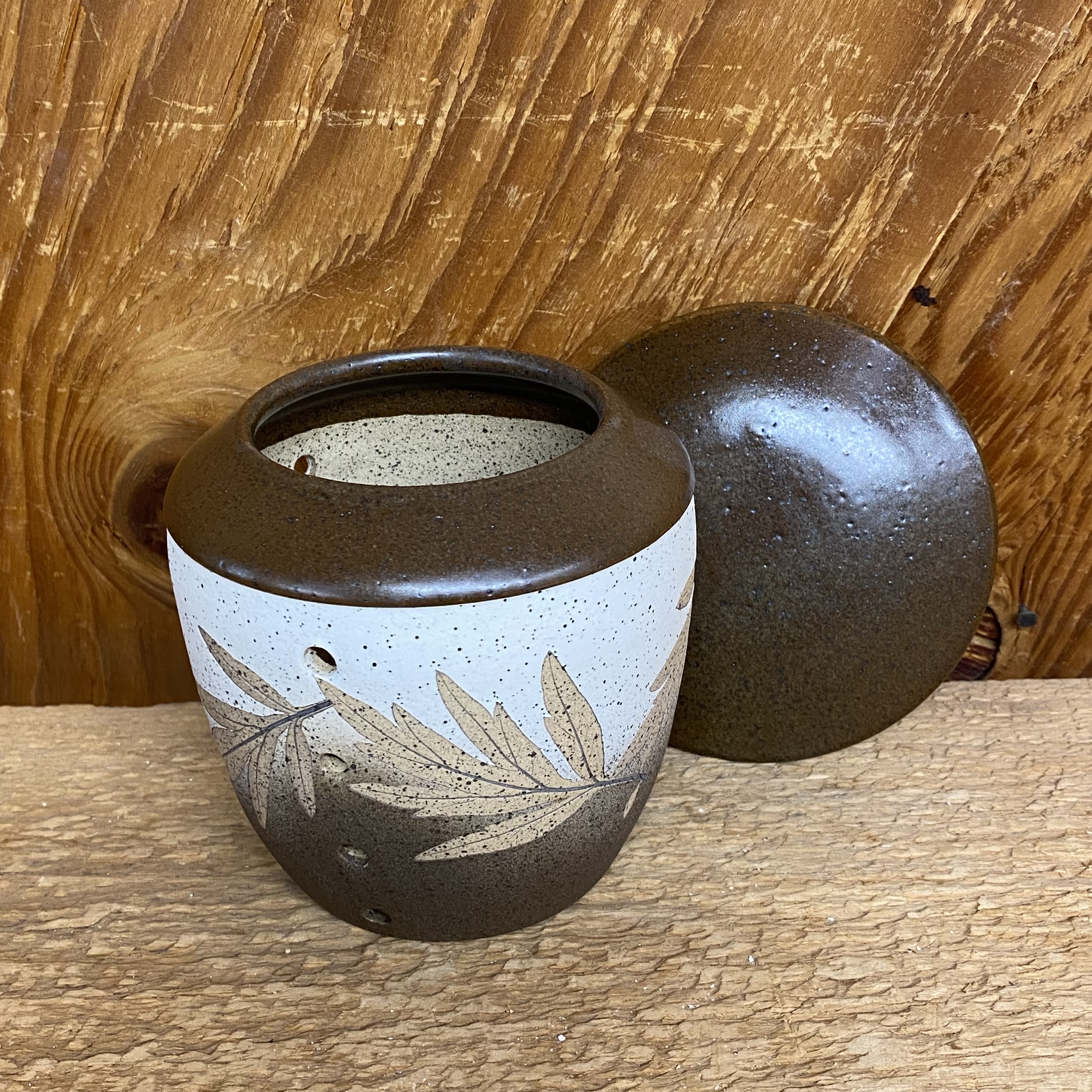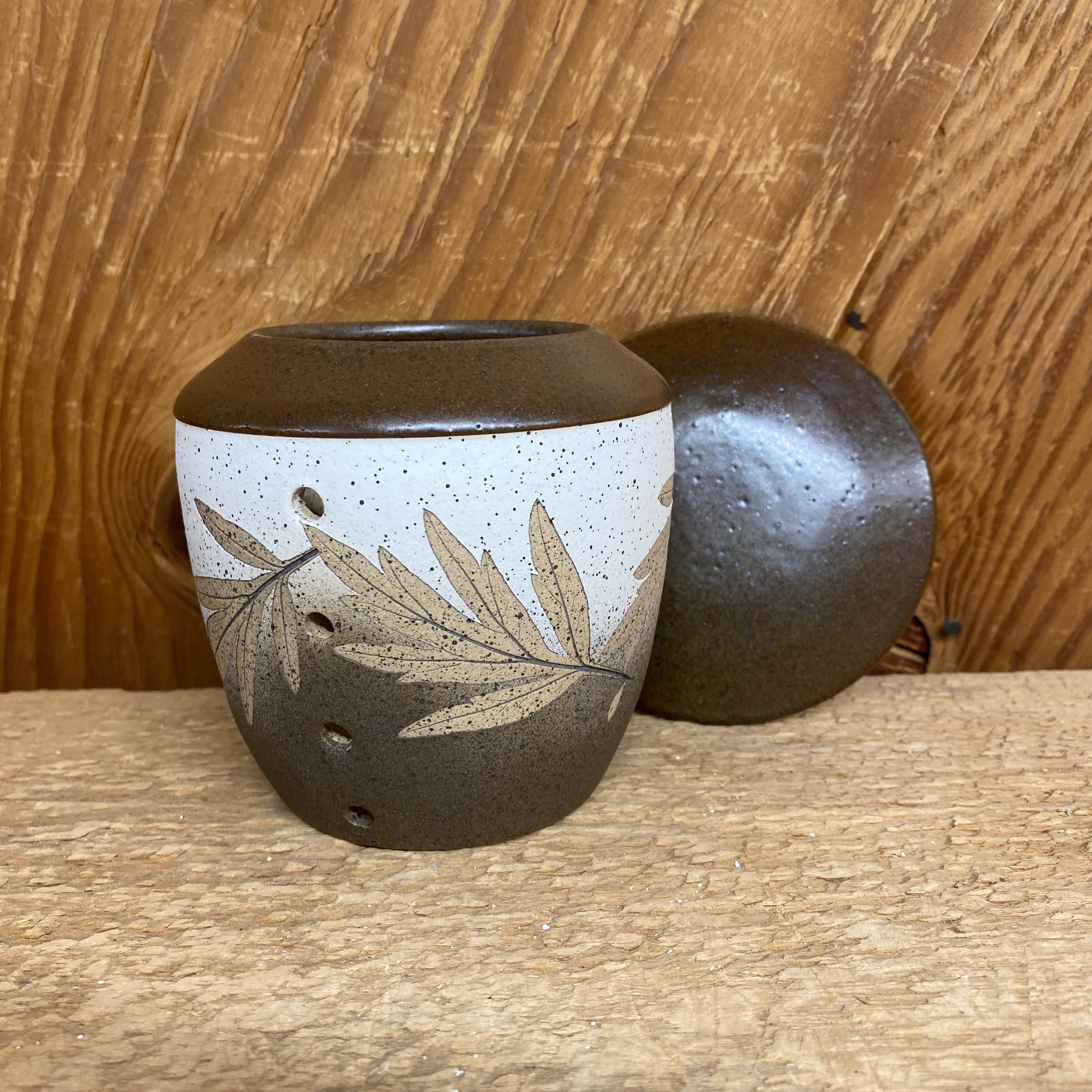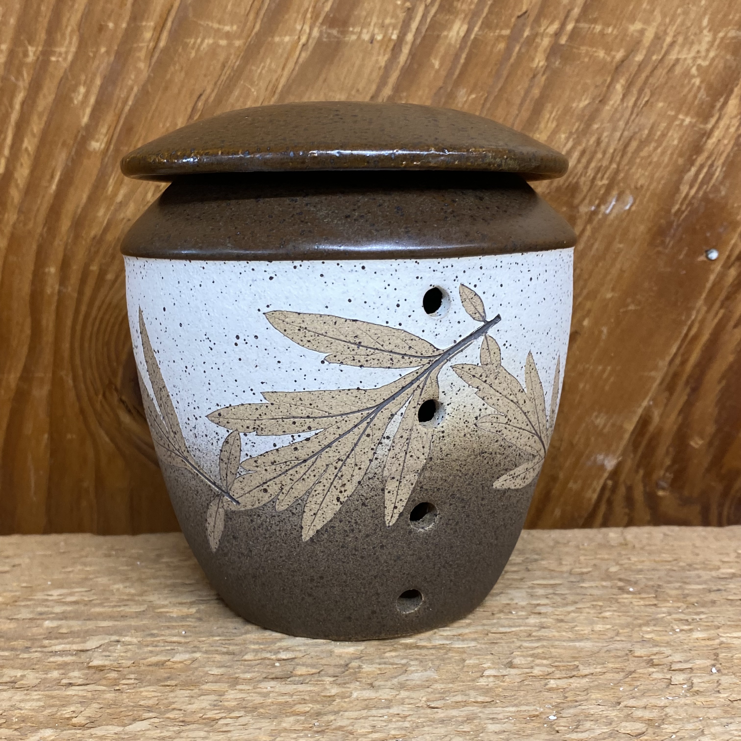 The air vents keeps our garlic jar ventilated, which keep the garlic cool and dry. While the lid protects the garlic from light for a longer shelf life and prevents sprouting. Measures approx. 4 1/2″ tall. Decorated with tan artemisia leaves on a white and brown background with a matte style brown glaze on the top. Leaf placement and design may vary slightly from the one pictured.