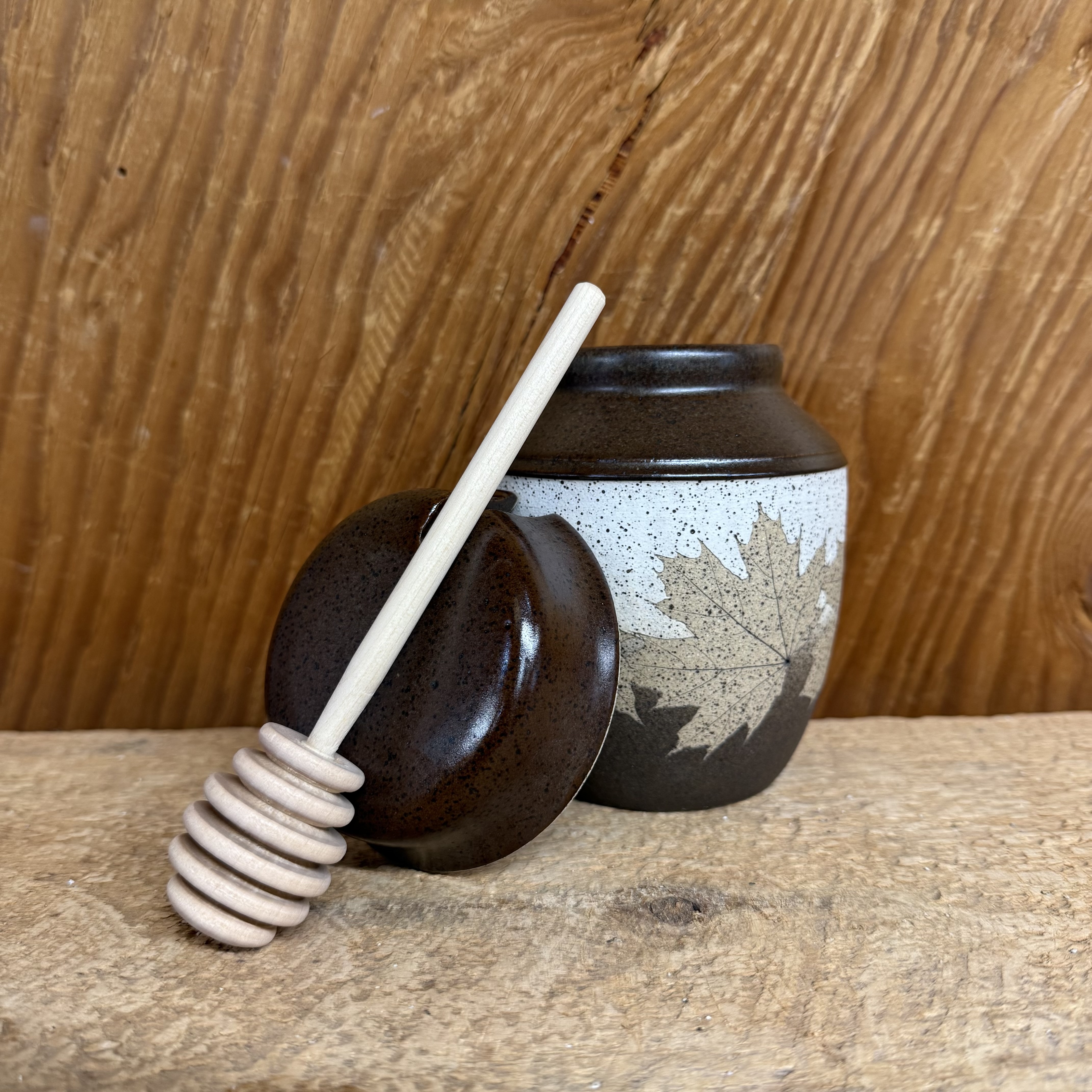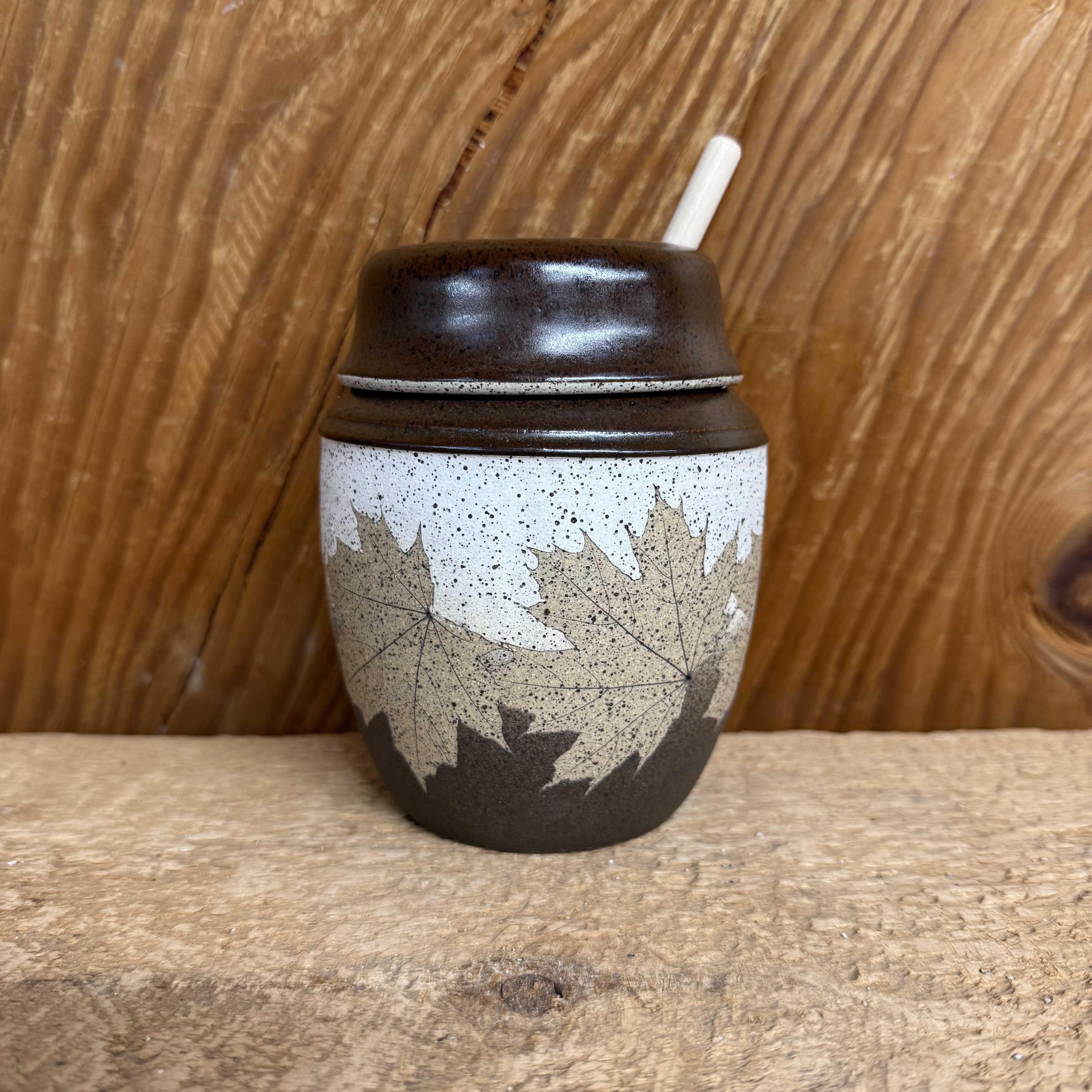 This is our regular sized honey pot.  Each one comes with a wood honey dip stick. We used sugar maple leaves on these, finished in our brown and white “matte-style” look, then glazed brown inside and on the lid. Measures approx. 5″ tall and holds about 16+ ounces. Lead free and dishwasher safe. Leaf placement and glaze design may vary slightly from the one in the picture.