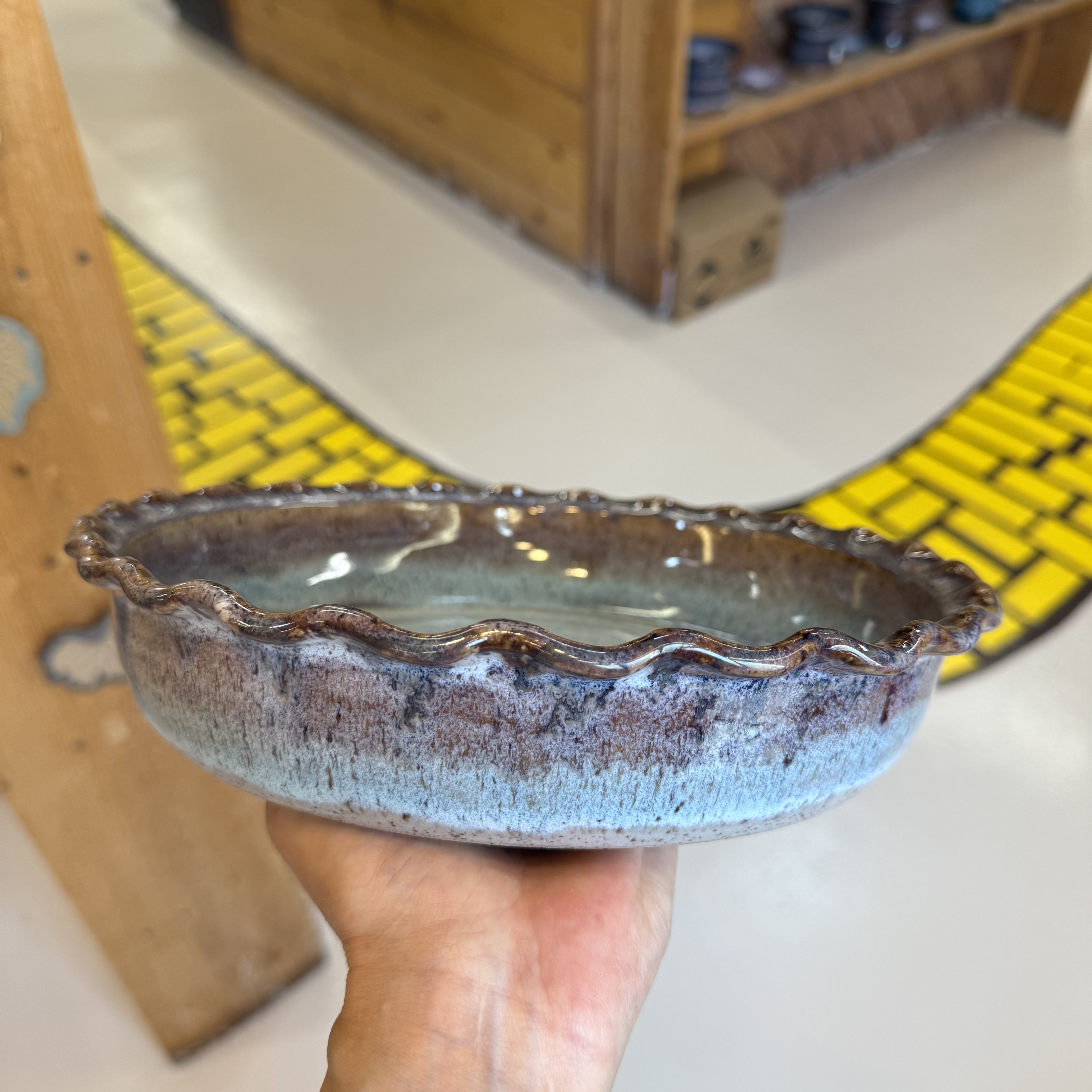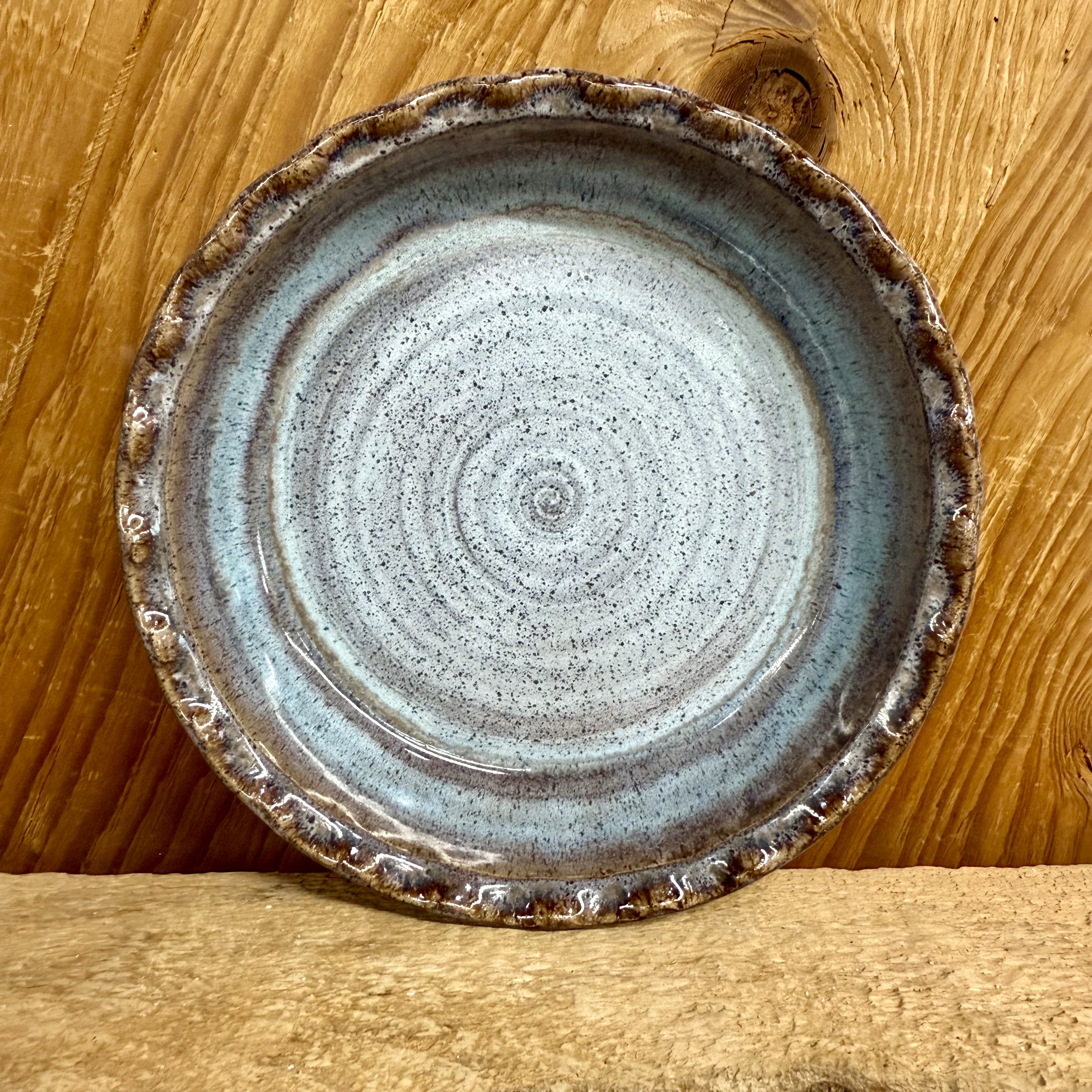 This beautiful small pie plate bakes evenly and cleans easily. Microwave, oven, and dishwasher safe. Measures approx. 10″ edge to edge (9″ inside) and approx. 2″ deep. Great for pies, dips, quiche, or pot pies. Glazed in shades of blues/ teal with hints of purple on a natural clay base. Glaze design may vary slightly from the one pictured.