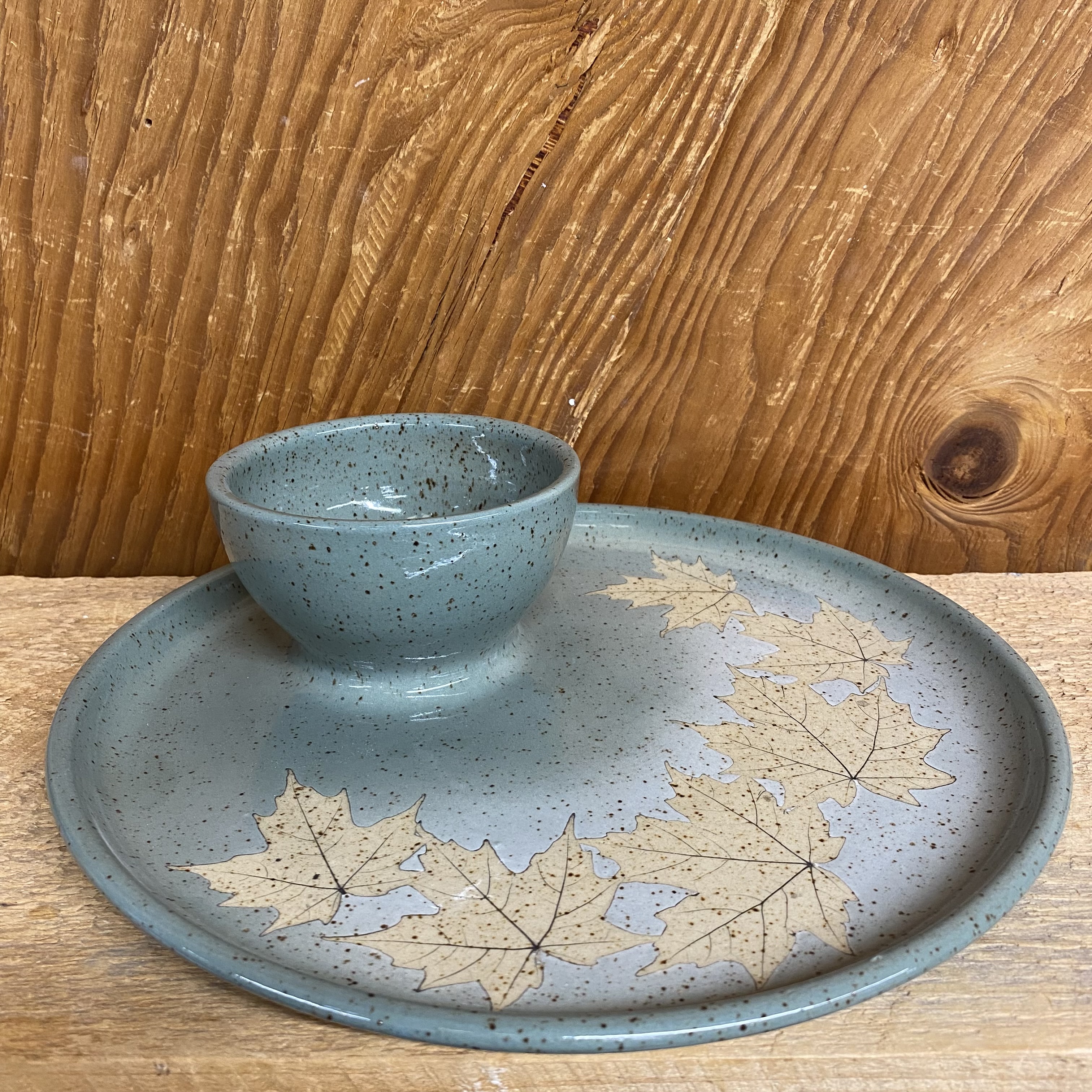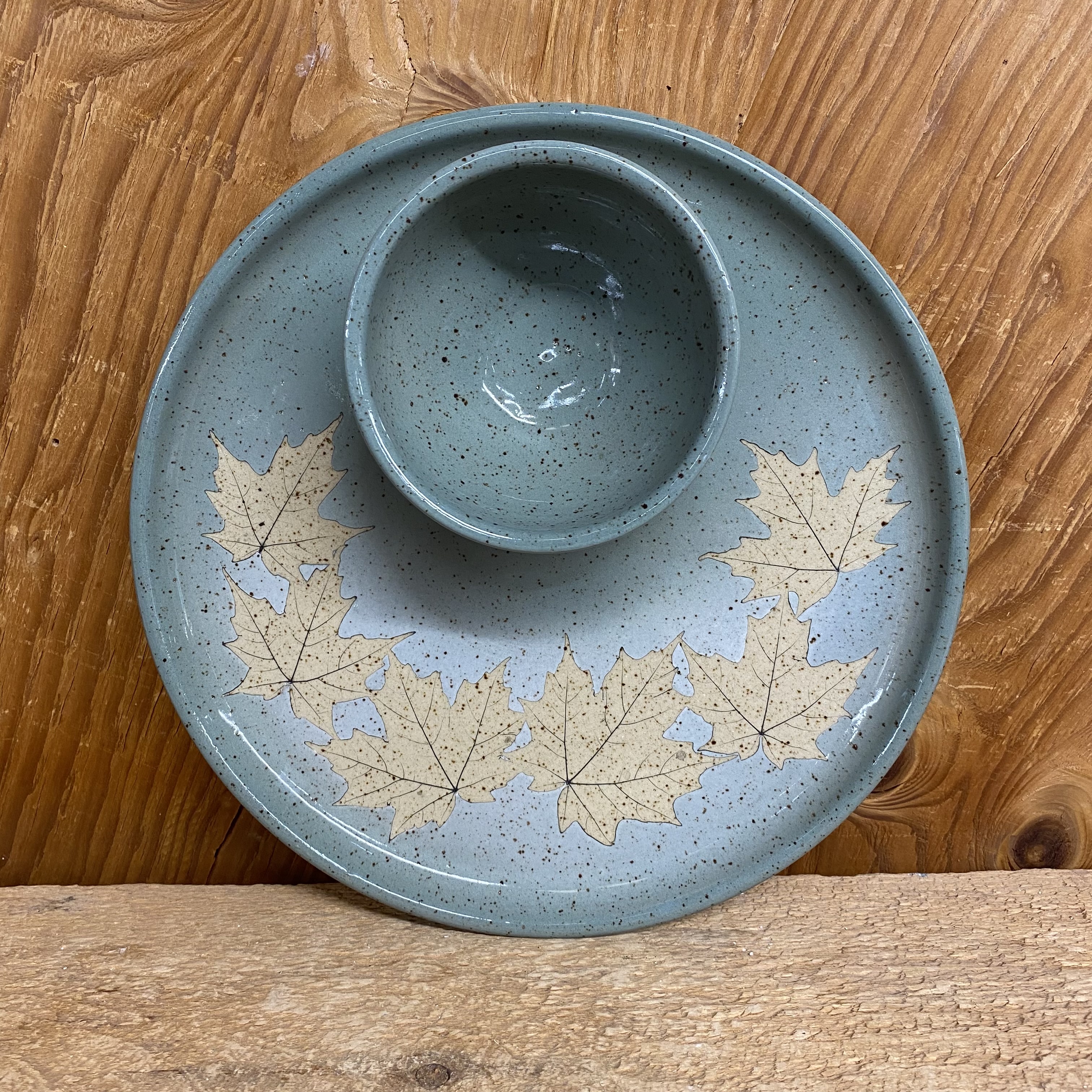 Call it a soup and sandwich plate or a large chip and dip. No matter what you call it, this dish will add beauty to your next party or meal. Oven, dishwasher, and microwave safe. Each piece has sugar maple leaves picked fresh from the property each morning and glazed in green with highlights of white. The plate measures approx. 11″ across. The attached bowl measures approx. 4″ x 2″ tall. Leaf placement and design may vary slightly from the one pictured.