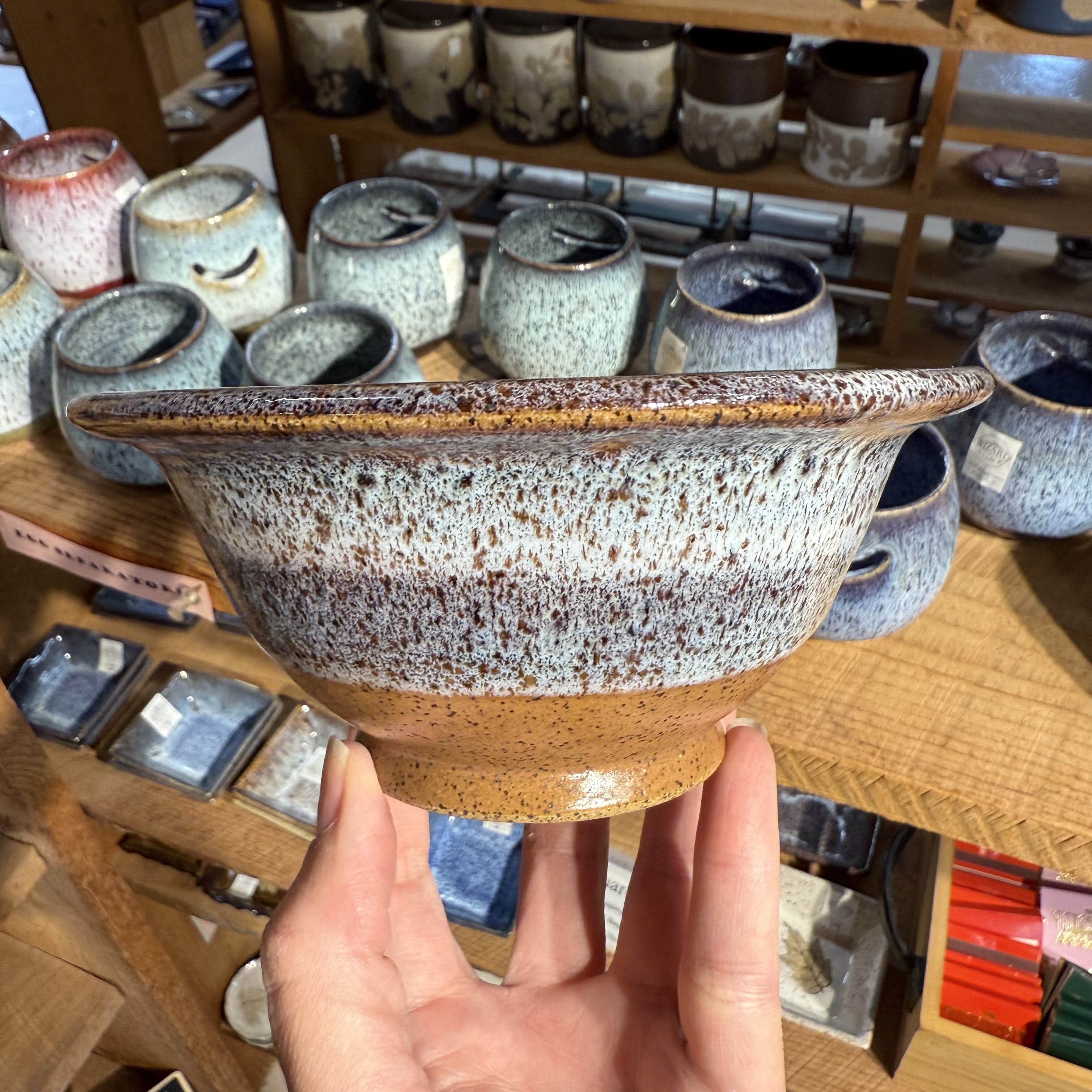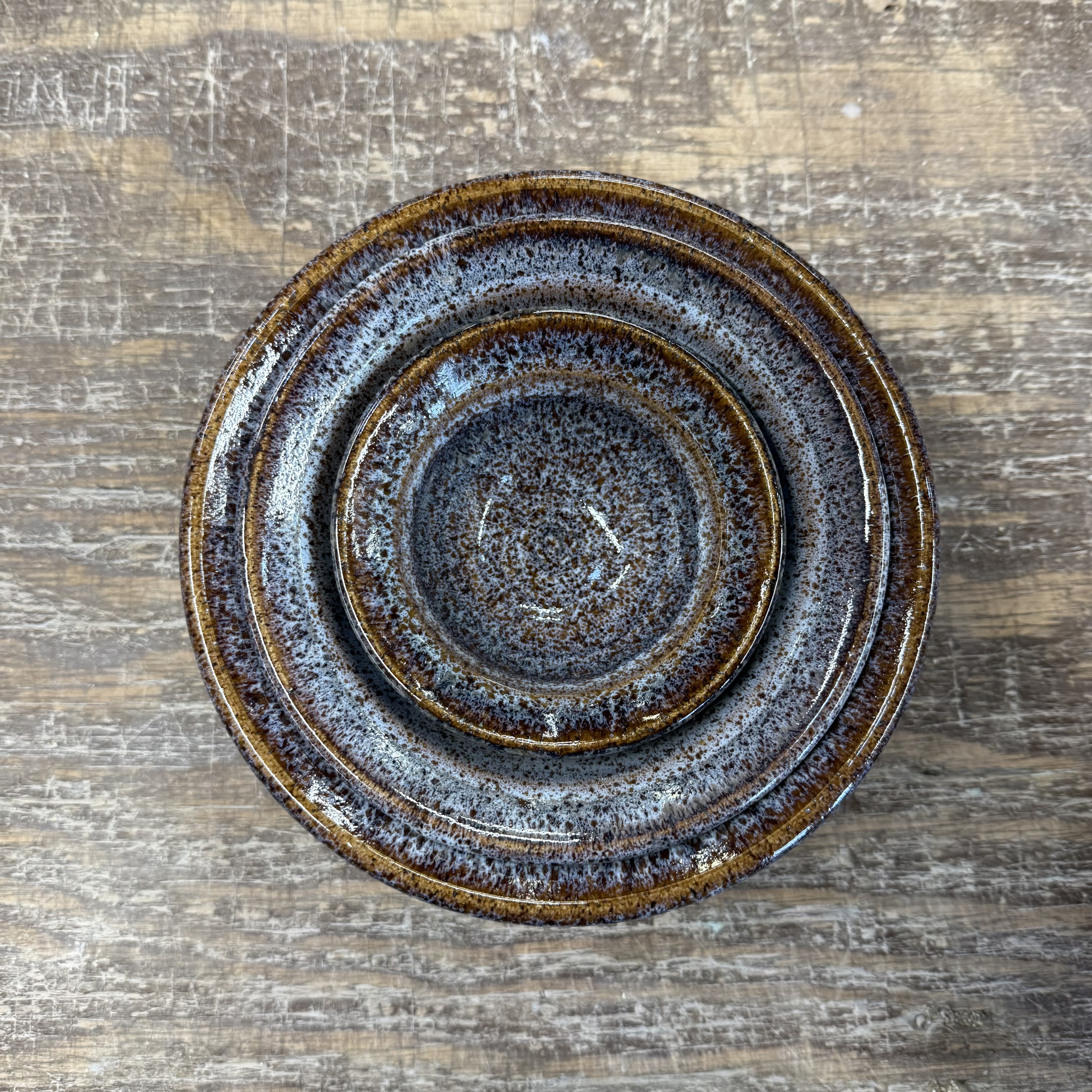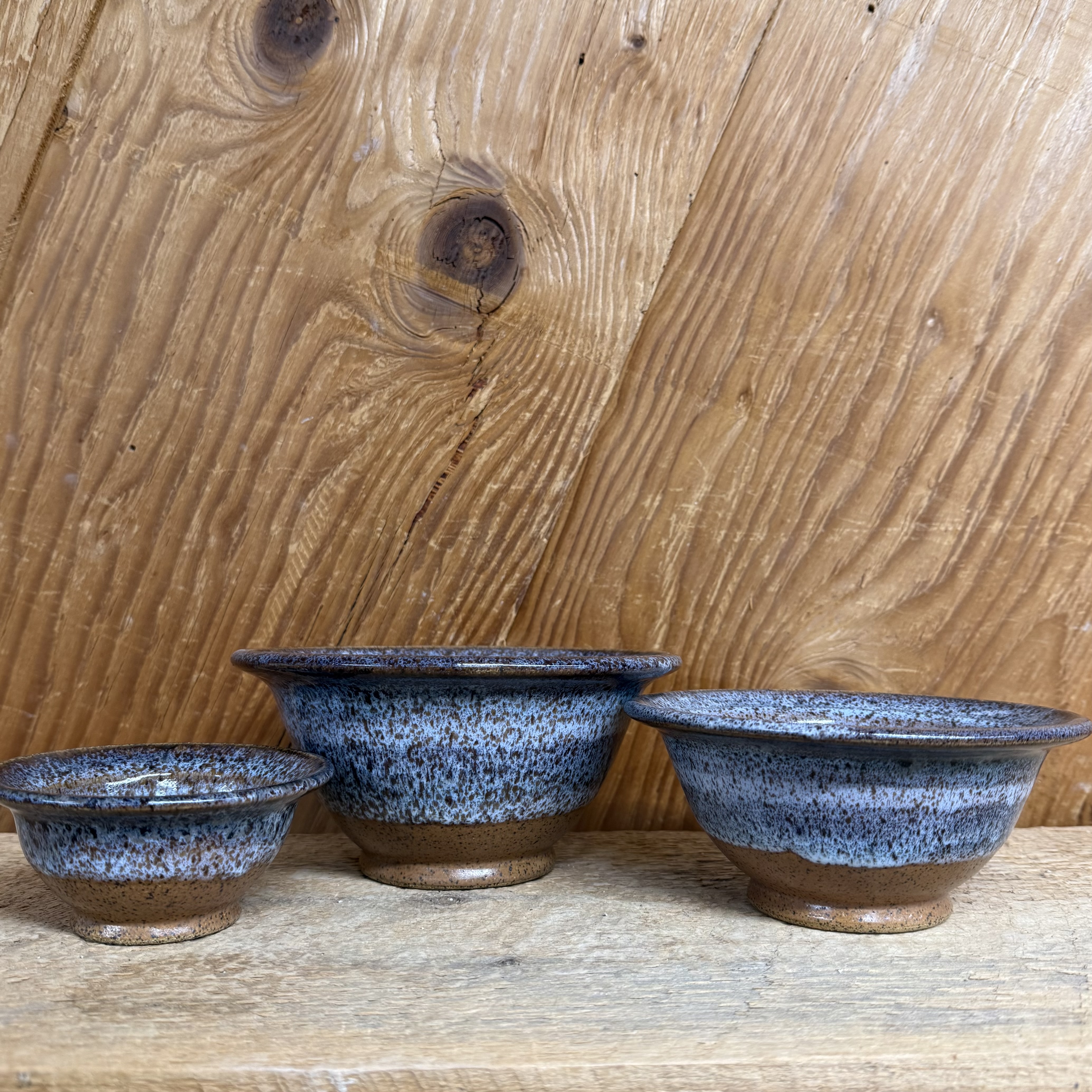 These beautiful nesting bowls fit inside each other for easy storage. This set of 3 is glazed in shades of blue/ frost with hints of hazelnut on a beautiful sienna (burnt orange) base color. Includes bowl widths of approx.  4 1/2″, 5 1/2″, and 6 1/2″ and each bowl is “flared” at the rim. The bowls are microwave, oven, and dishwasher safe.  NOTE: There is a glare on bowls in the picture. Glaze design may vary slightly from the ones pictured.