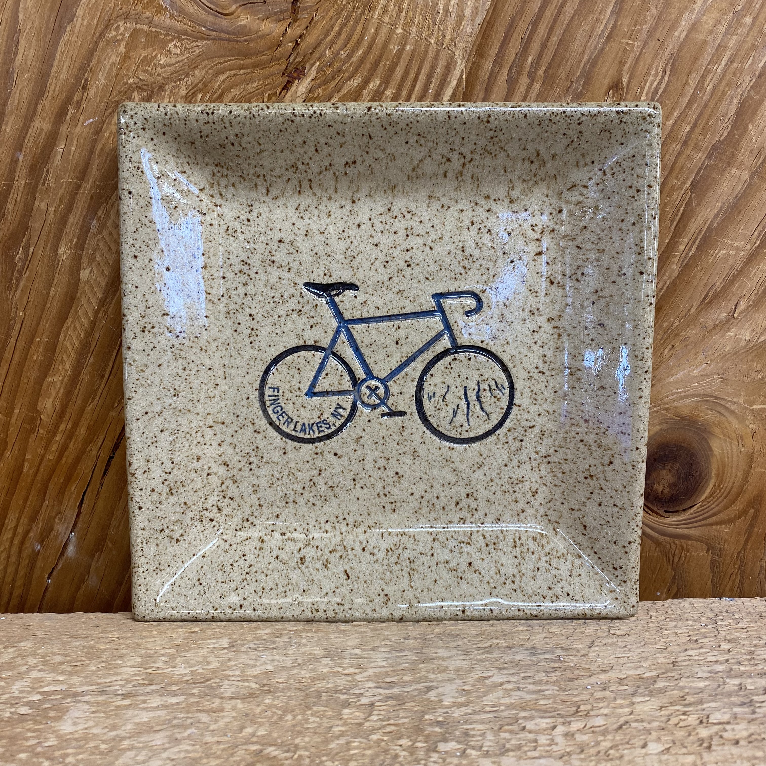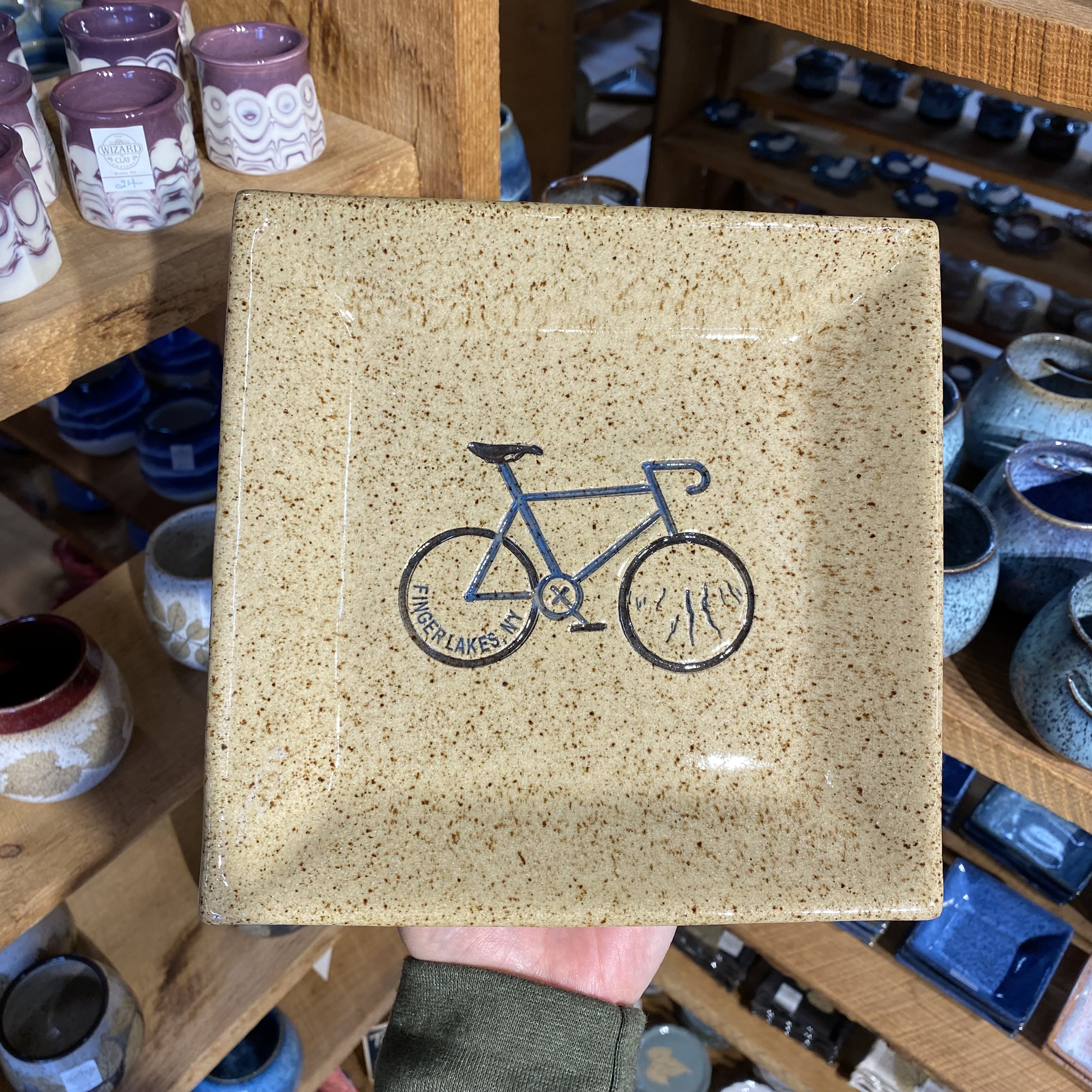 A 1st of their kind from Wizard of Clay. Lead free and dishwasher, microwave, and oven safe. This square tray measures 7 1/2″ x 7 1/2″ and has a blue bicycle on it, with blue Finger Lakes, on a natural clay background. This design was created right here, at the Wizard of Clay.