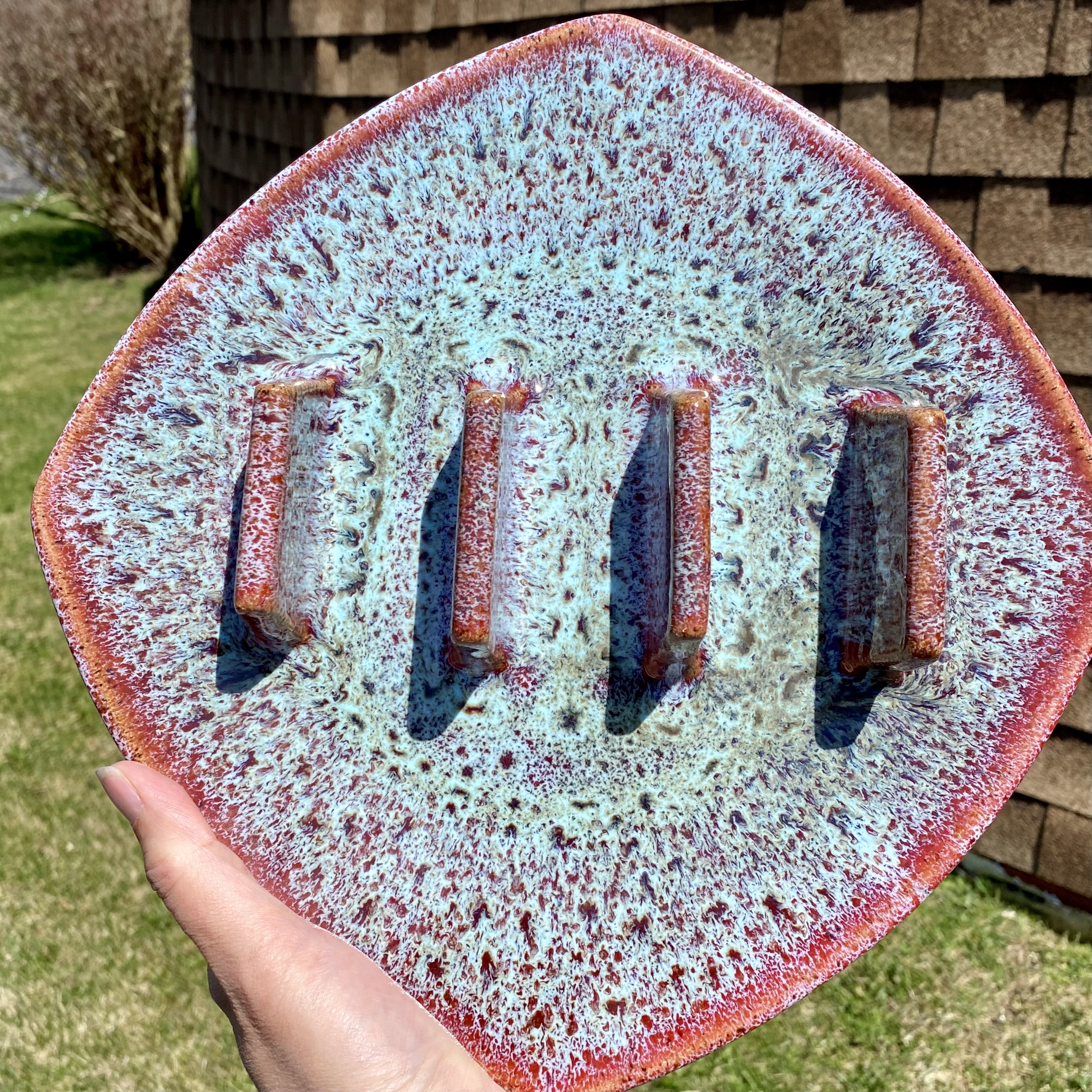 Back by popular demand! Hand-crafted for one of our staff members who always complains that her crunchy tacos fall over when you try to fill them. Holds 3 soft or hard tacos with space around the outside for guacamole, salsa, or sour cream. Lead free and dishwasher, oven, and microwave safe. Glazed in drippy shades of greens and teal on a bright red base color. This glaze is even prettier in person. Measures approx. 10 1/2″ x 10 1/2″.