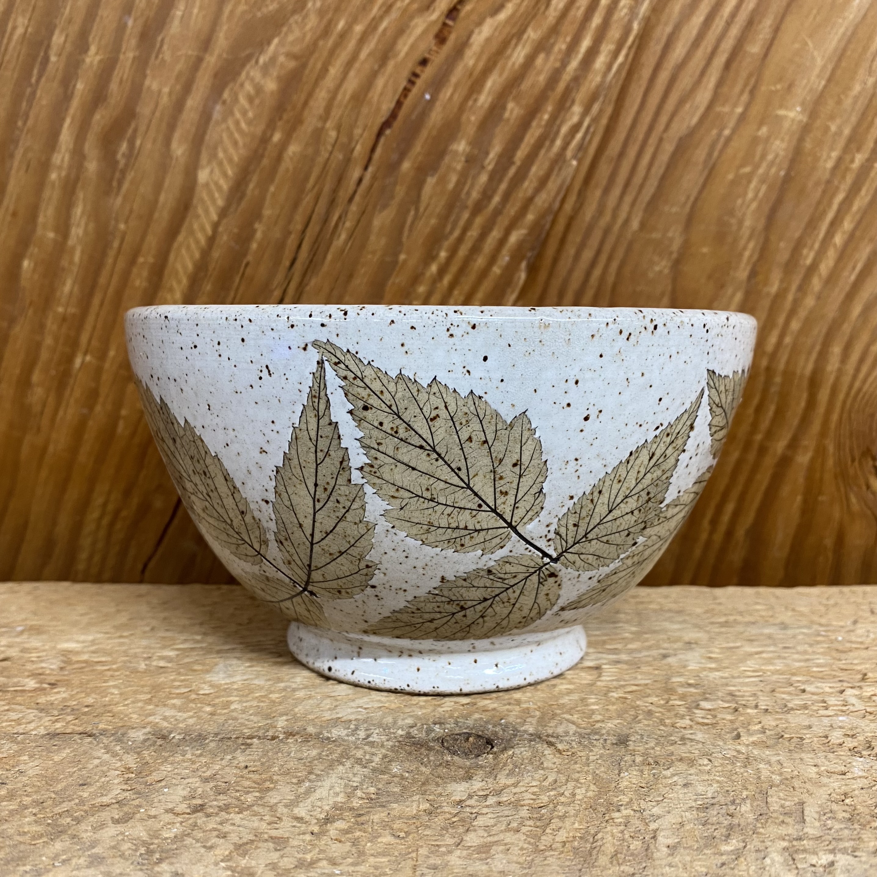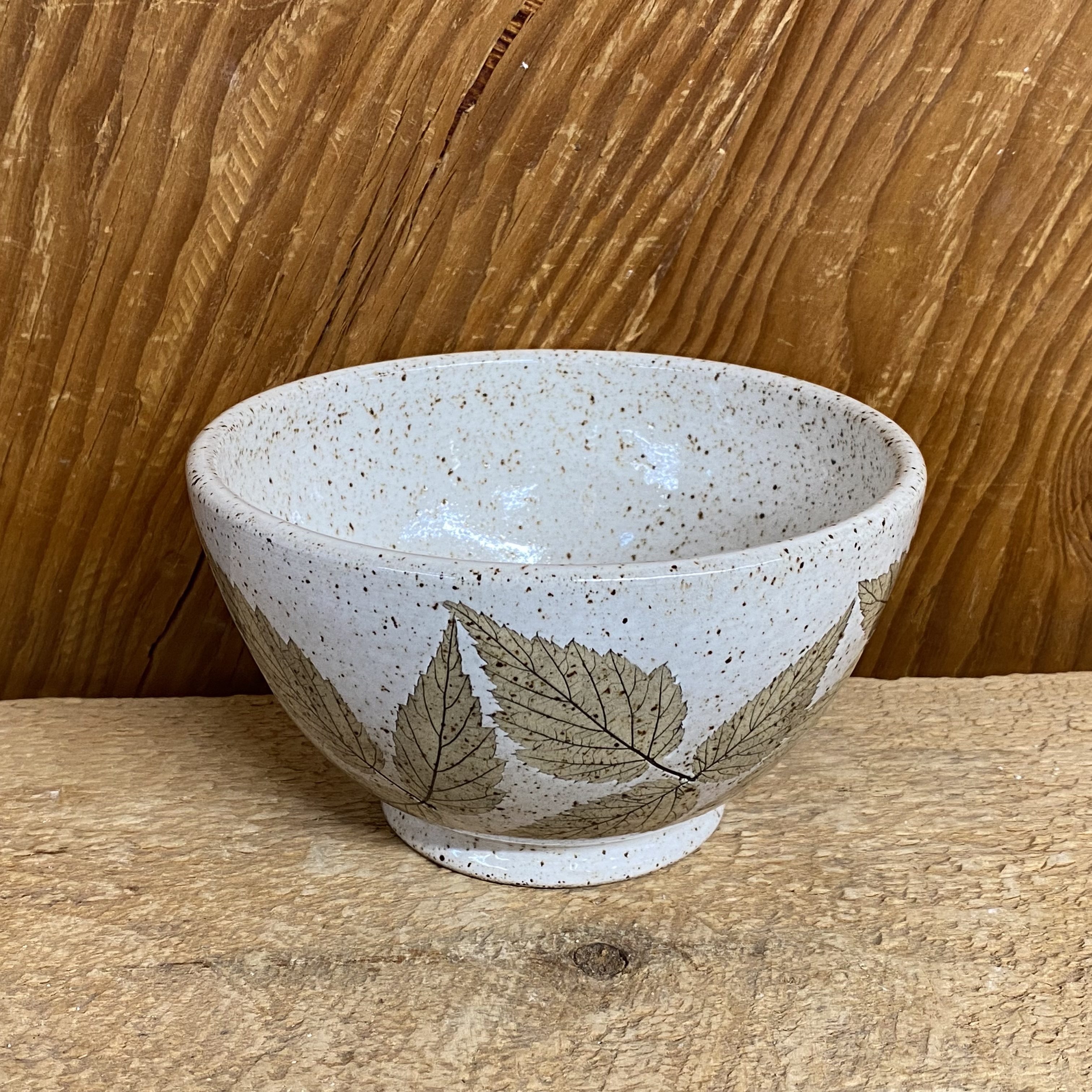 This beautiful bowl is perfect for cereal, guacamole, or just about anything. Measures approximately 3+” tall x 6″ wide. Tan wild raspberry leaves on a white background, finished with a shiny glaze. Microwave, dishwasher and oven safe. Leaf placement and design may vary slightly from the one pictured.