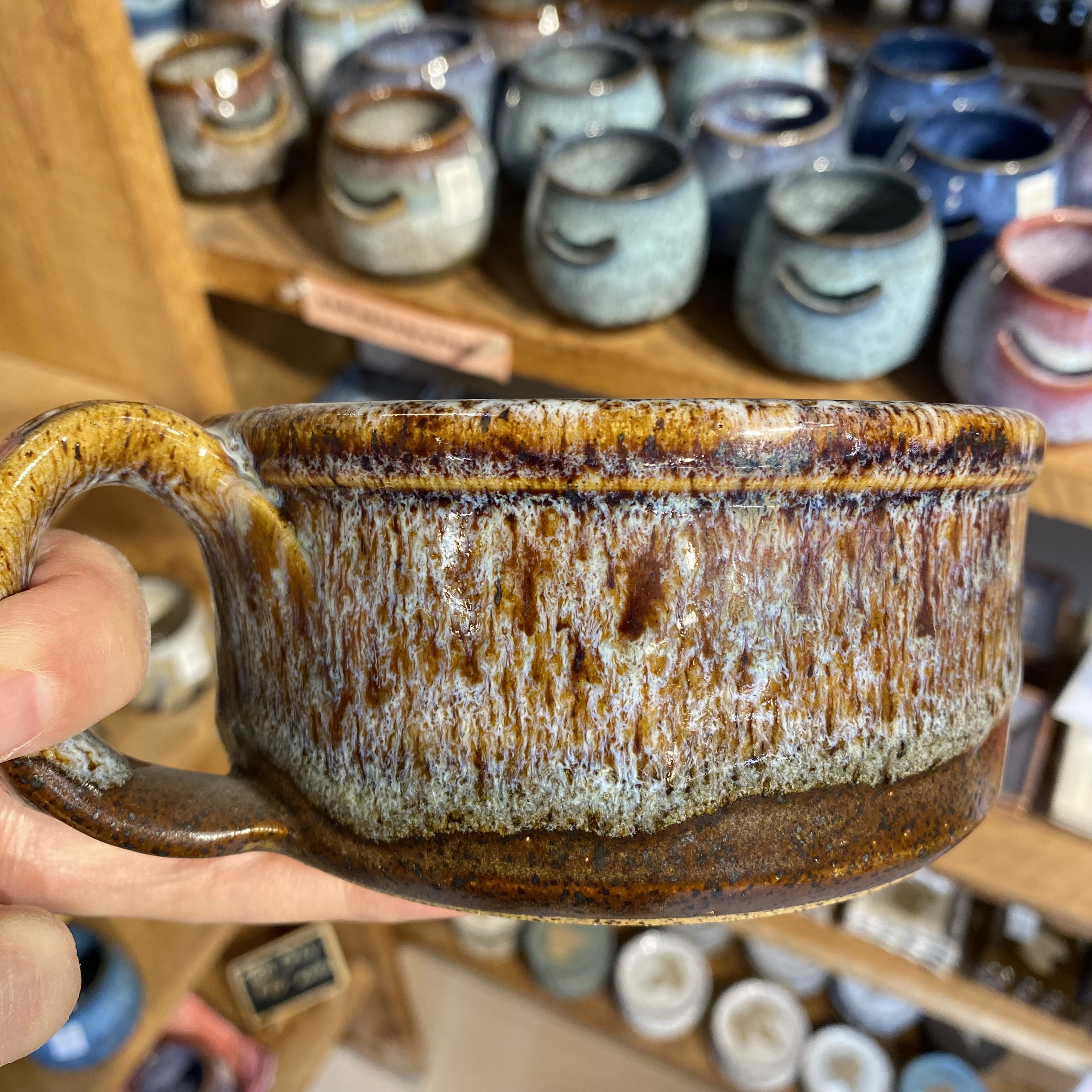 We originally designed this bowl for French onion soup, but find it’s handy for so much more: salad, popcorn, ice cream…holds about 2 1/2 cups. Glazed in varying shades of light blue with hints of purple/ hazelnut on a brown base color. This glaze is even prettier in person!! Glaze design may vary slightly from the one pictured.