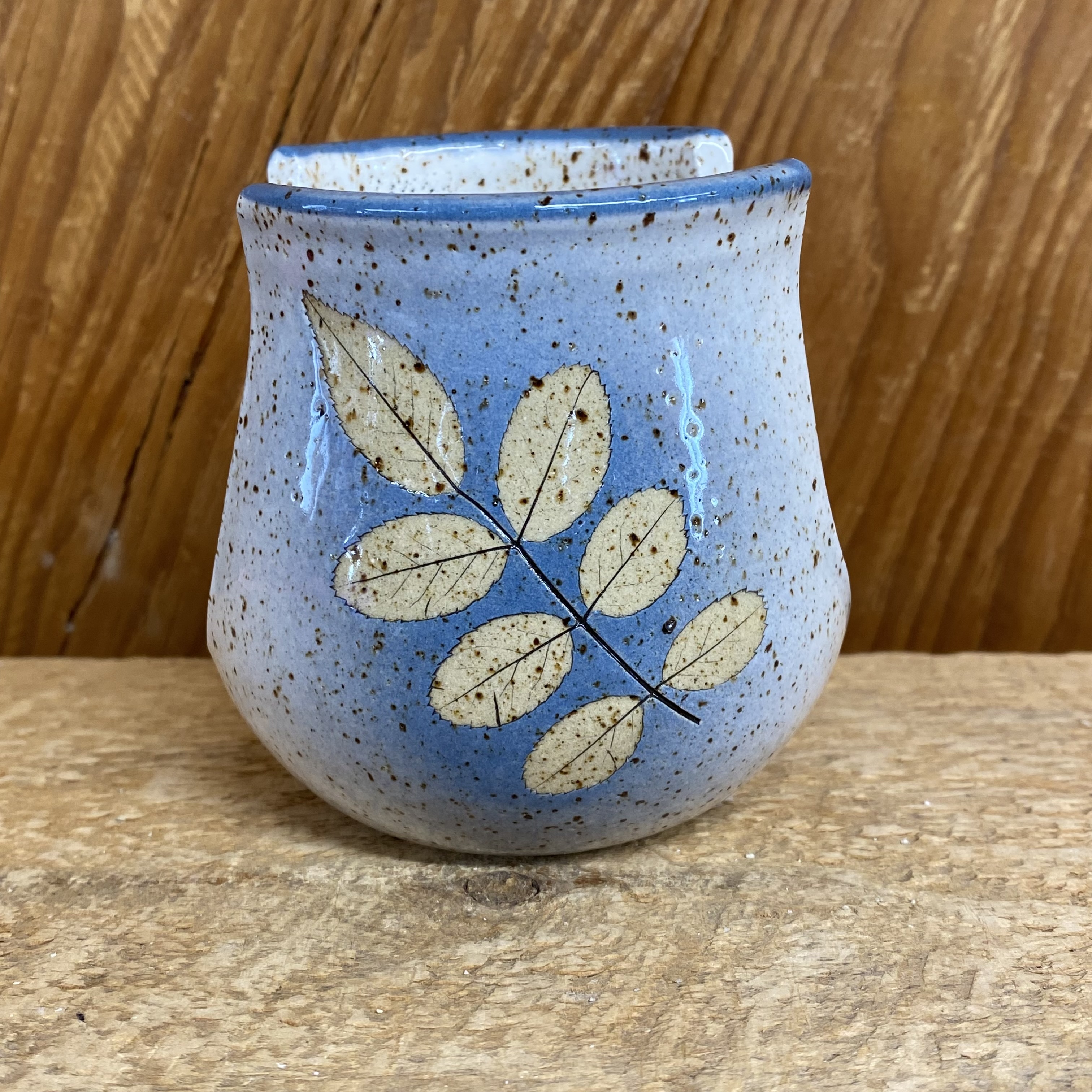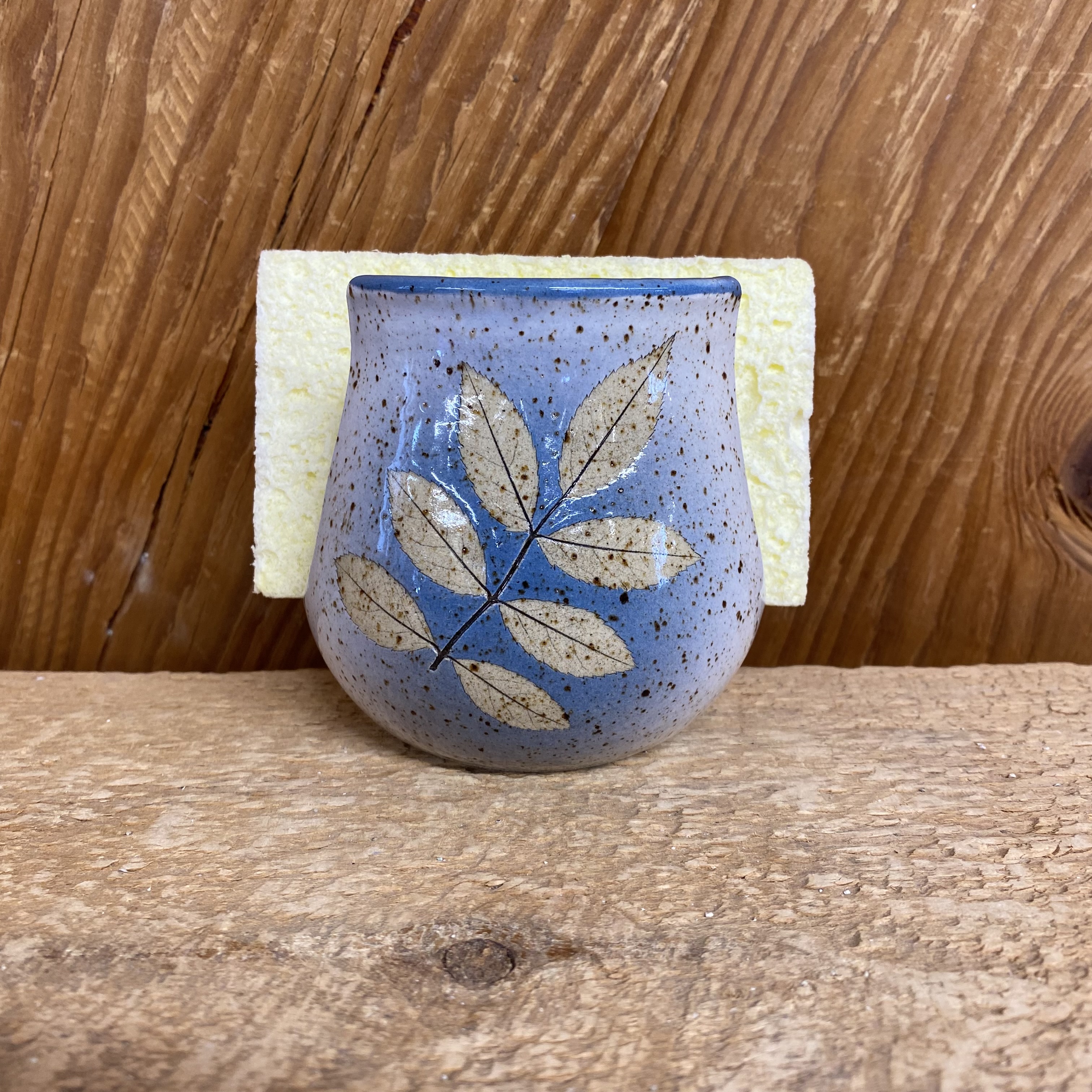 A pretty place to keep your sponge! This can also be used to hold your 3 or 5 oz. bathroom “dixie” cups. Measures approx 3 1/2″ x 3 1/2″. Tan wild rose leaves on a blue and white background then finished with a shiny glaze. Dishwasher safe for easy cleaning! Leaf placement and glaze design may vary slightly from the one pictured.