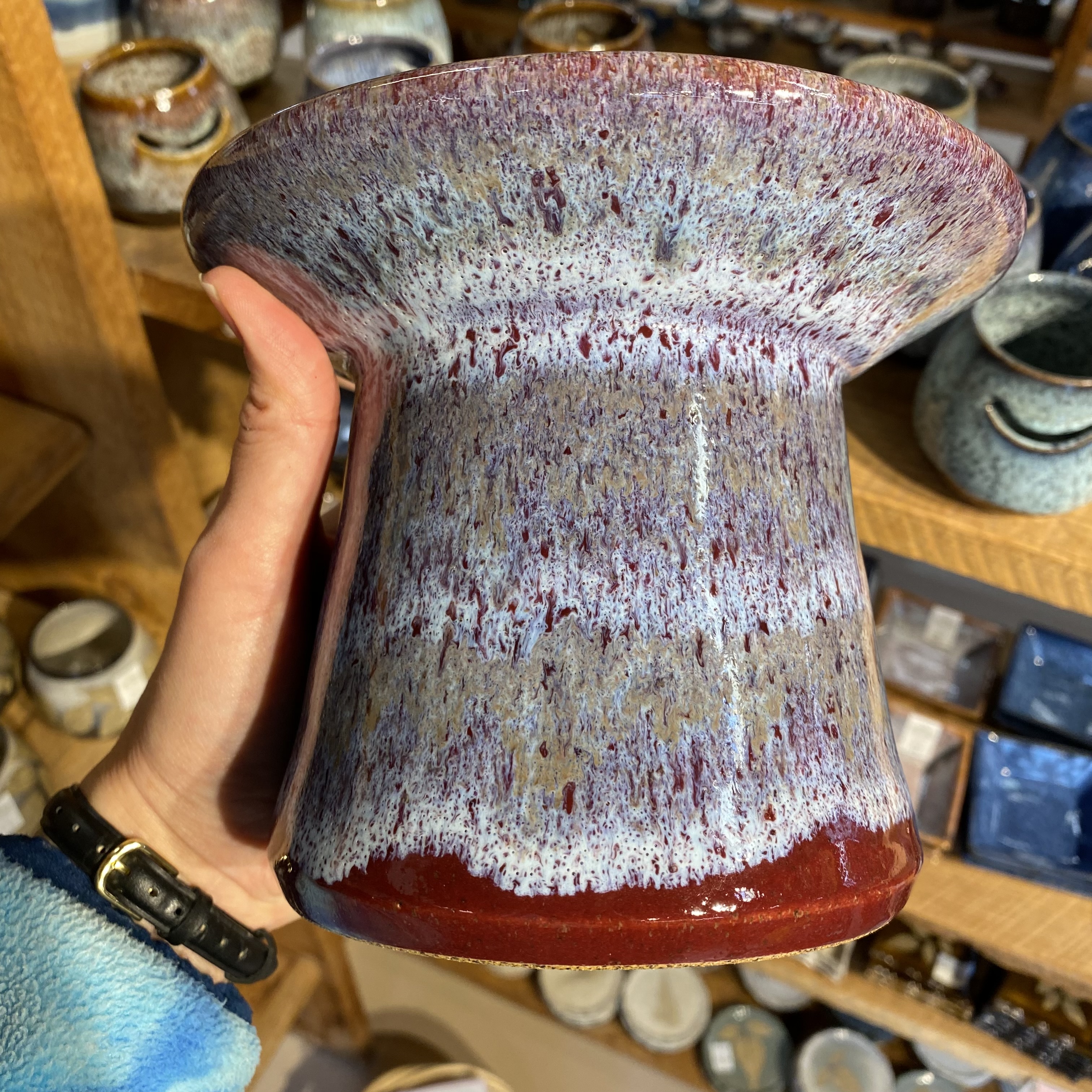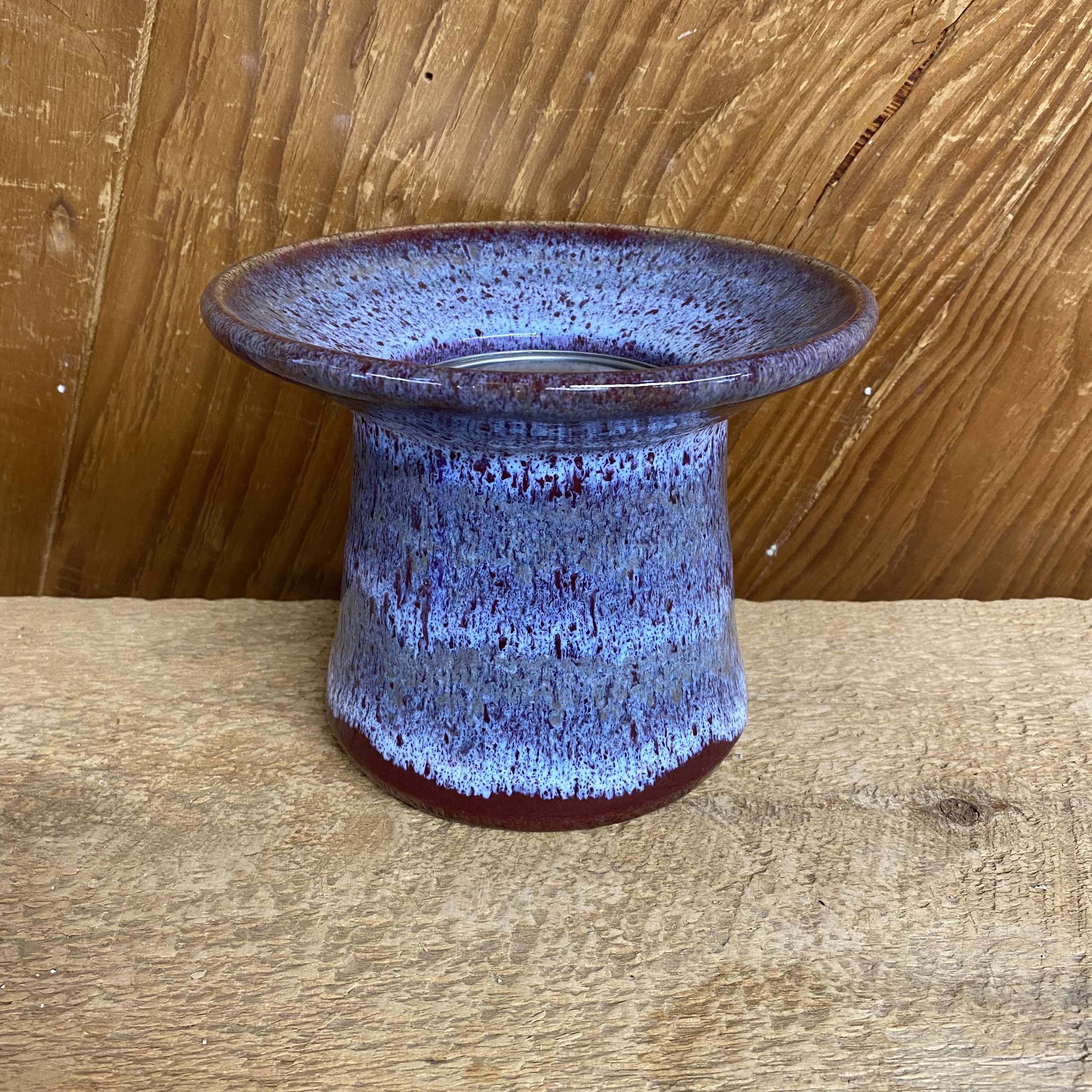 Our popular “patio lantern” is a fun way to add a little light to your life. Just light the realistic crackling gel fuel (included) with a long/ BBQ style lighter (not included) and viola! These are glazed in light blue with hints of purple on a deep, rich, burgundy base color. Each one measures just over 5″ tall and approx. 6 1/2″ wide rim to rim. Glaze design may vary from the one pictured.