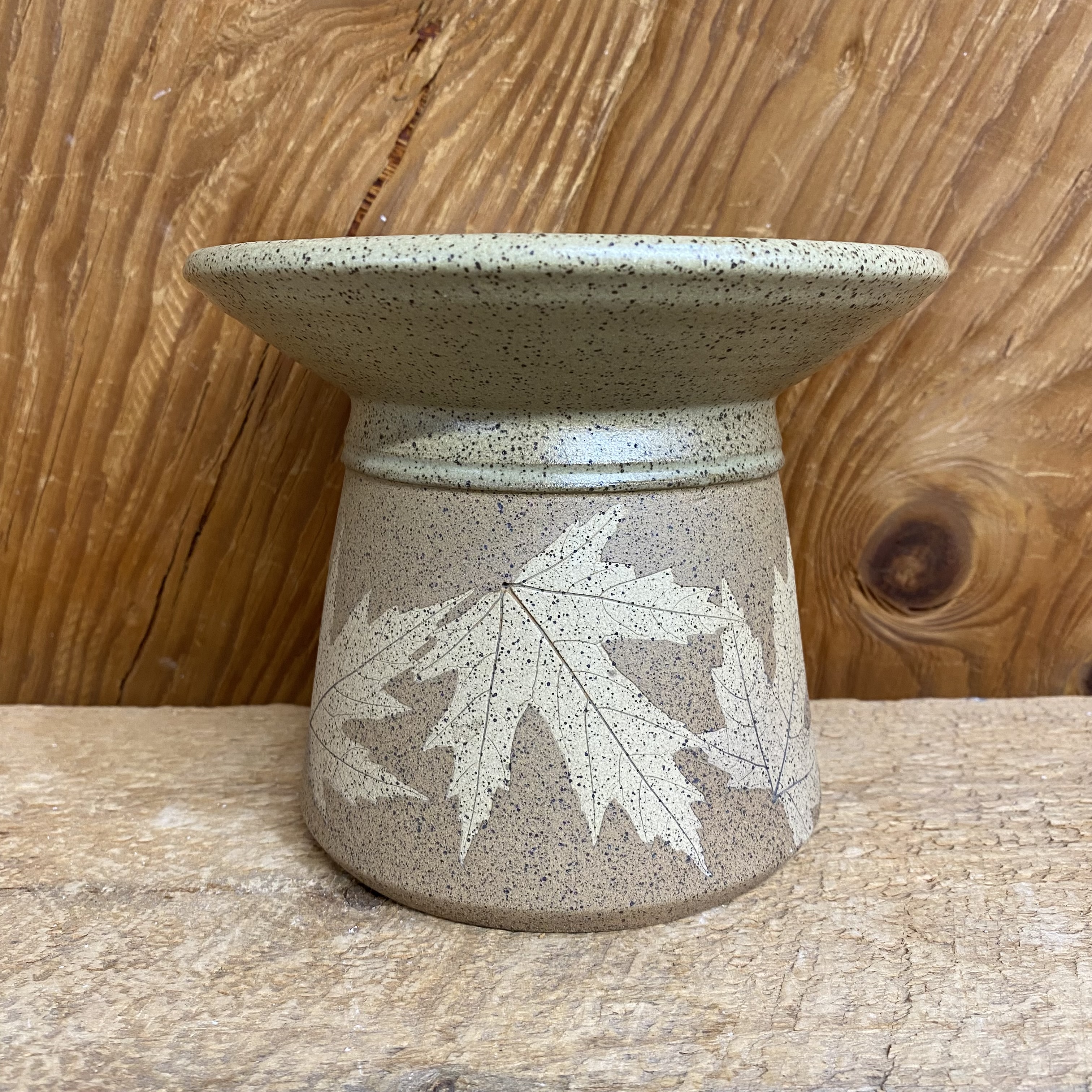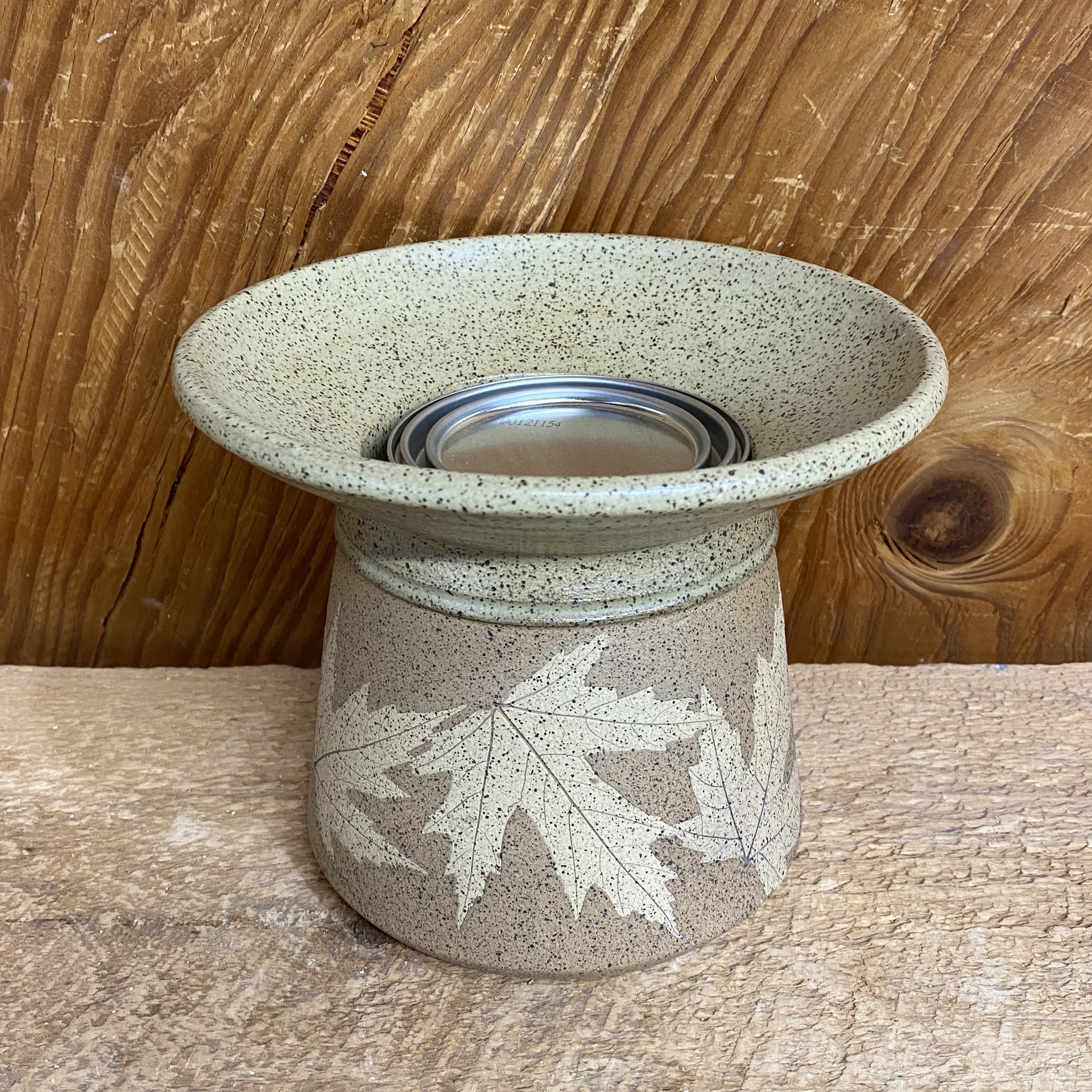 Our popular “patio lantern” is a fun way to add a little light to your life. Just light the realistic crackling gel fuel (included) with a long/ BBQ style lighter (not included) and viola! These have a lighter brown matte-style finish on the bottom, with a tan glaze on the top and inside. We used sugar maple leaves on these. Each one measures just over 5″ tall and approx. 6 1/2″ wide rim to rim. Leaf placement and design may vary from the one pictured.