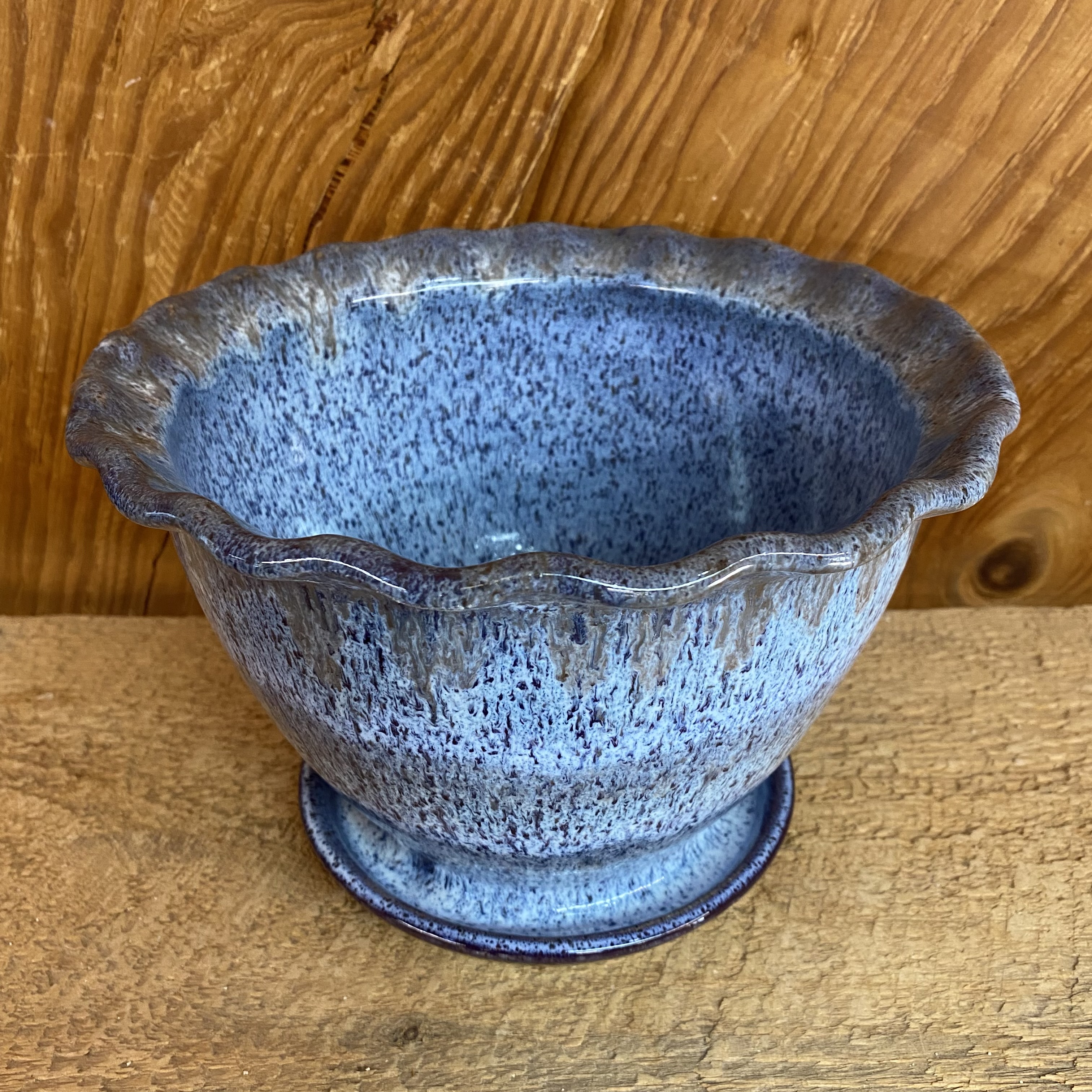 Showcase your favorite houseplant or grow your favorite seasoning herb in this lovely planter with drip pan. This is a large one that measures approximately 8 1/2″ wide x 5 1/2″ tall. Glazed in shades of blues with purple on a deep purple under glaze. Glaze design may vary slightly from the one pictured.