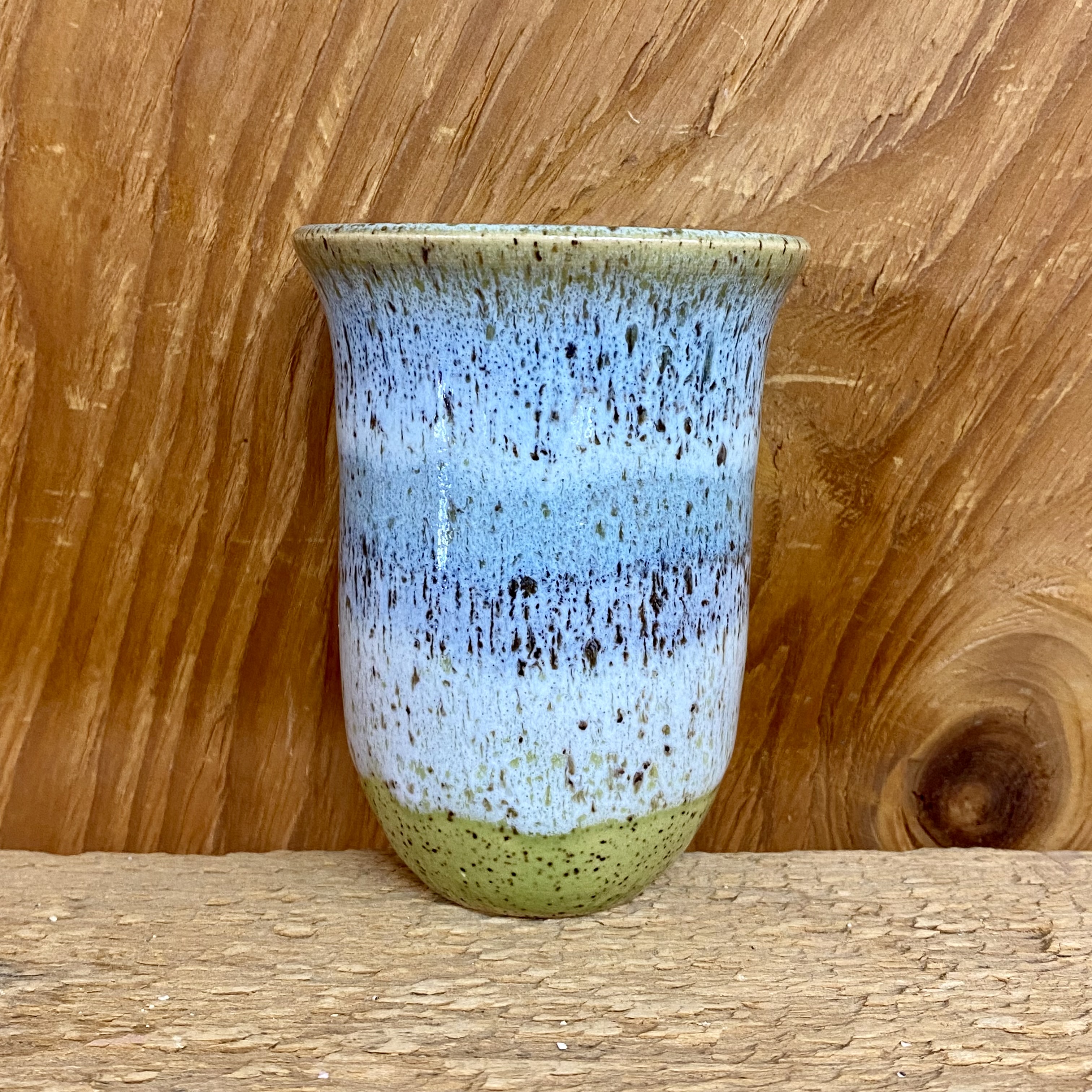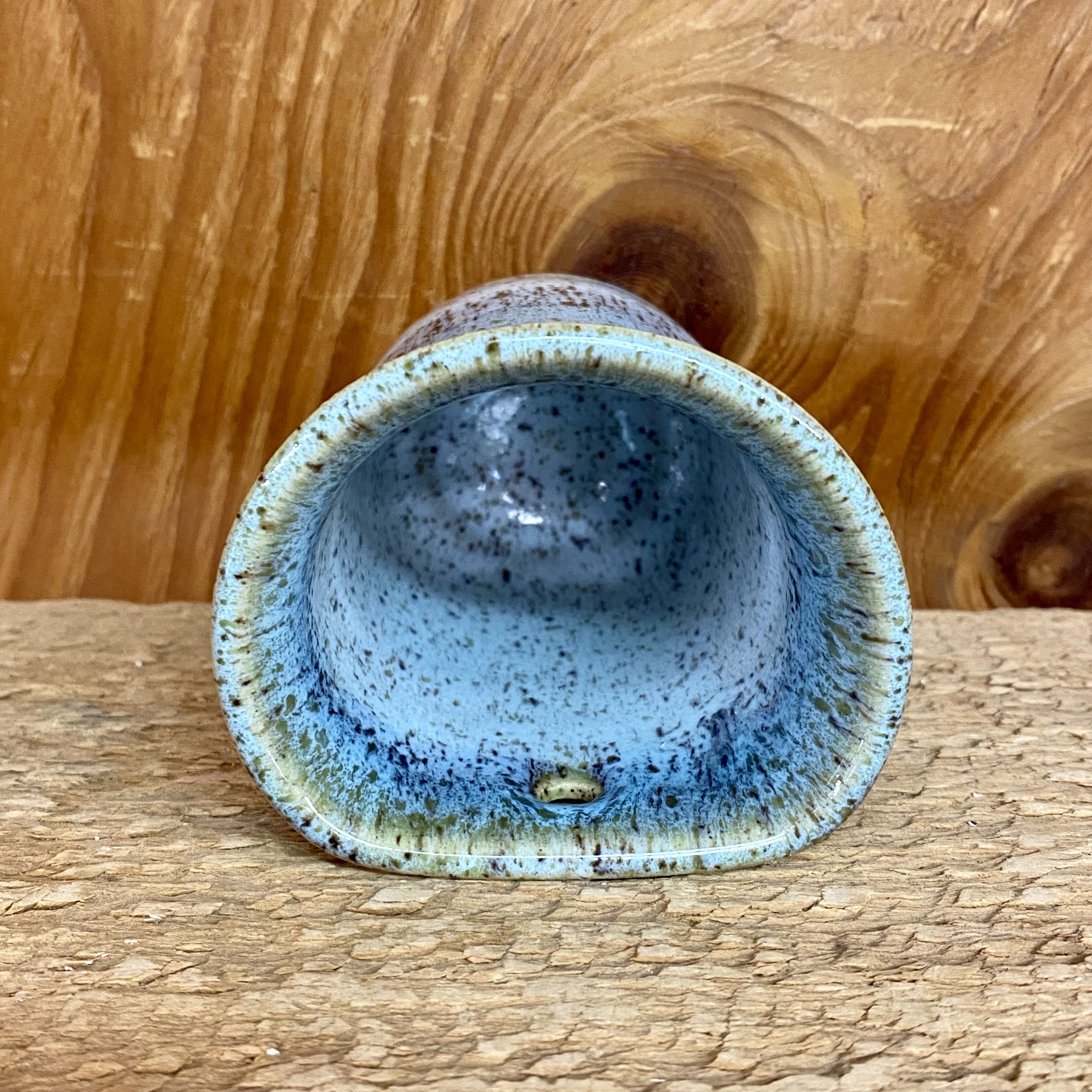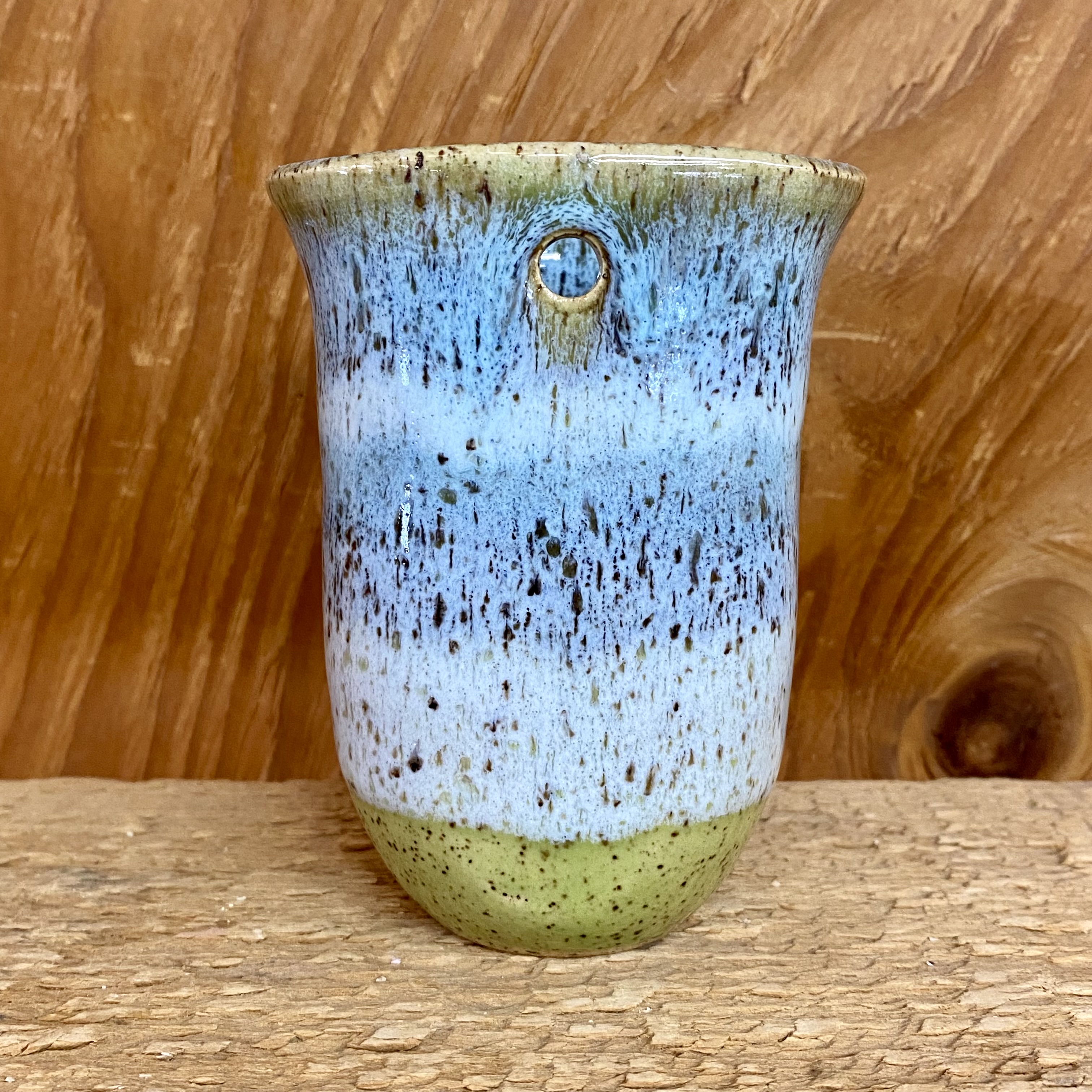 PLEASE EMAIL OR CALL THE STORE FOR AVAILABILITY. They’re back! After many (many) years, and lots of requests, we finally brought them back. There are 4 sizes and this is the smallest size. Each comes with a hole in the back to hang it to the wall. The flat back also works great on a shelf or in a windowsill too. Glazed in a shades of blue/ teal with hints of purple on a lime green base glaze. Approx. 3 1/2″ tall with an opening of 2 1/2″ flared edge to edge. Each piece is hand-glazed, therefore, glazing may be slightly different than the one pictured.