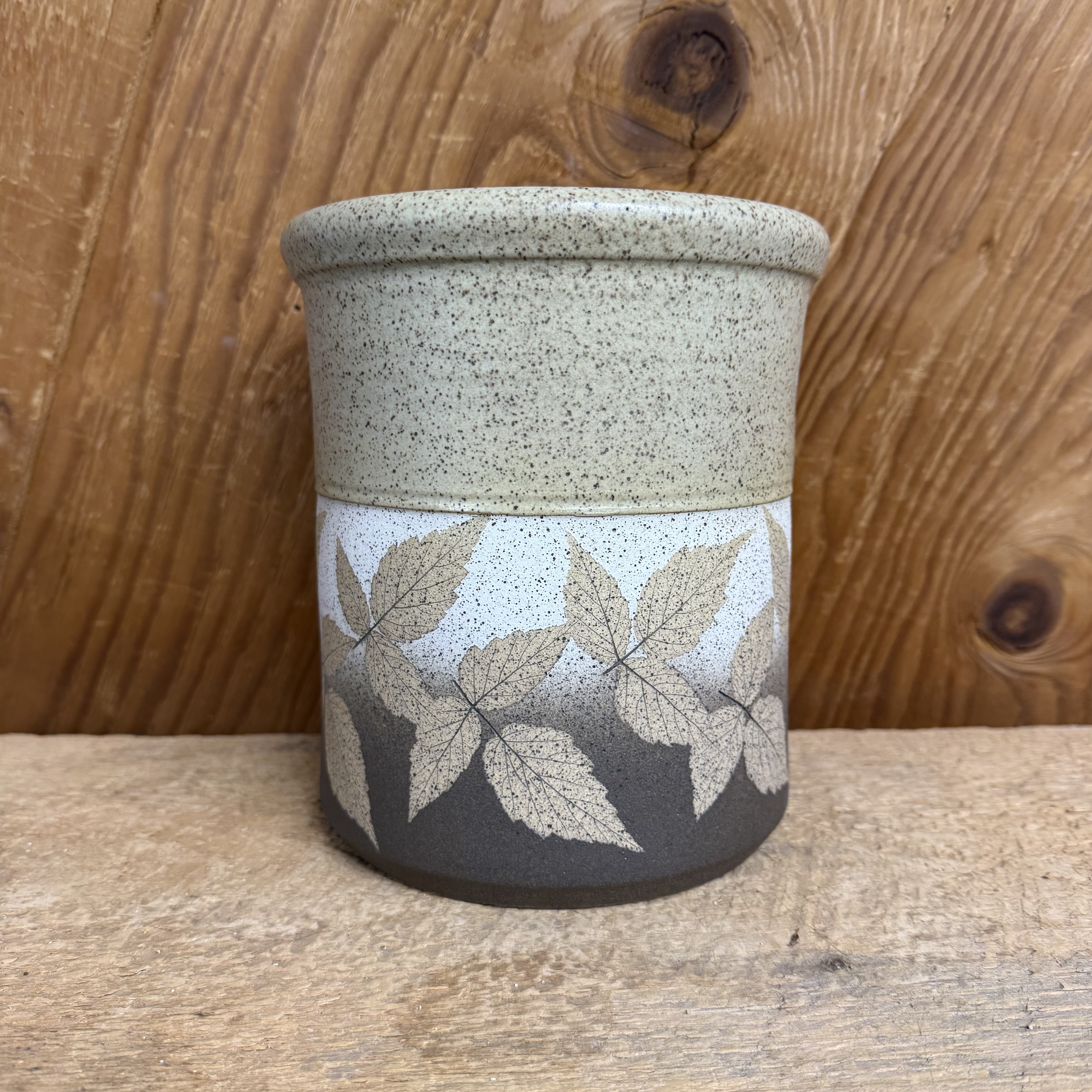 Say Congratulations and Best Wishes to Erica and David with this beautiful Bristoleaf utensil holder. We use real leaves on each of these. This one has raspberry leaves with a brown and white matte-like style on the bottom and tan glaze inside. This utensil holder on their counter creates a daily reminder of the journey Erica and David are on. All of our pottery is lead free. Measures approx. 8 x 6 1/2 “. Microwave, dishwasher, and oven safe.