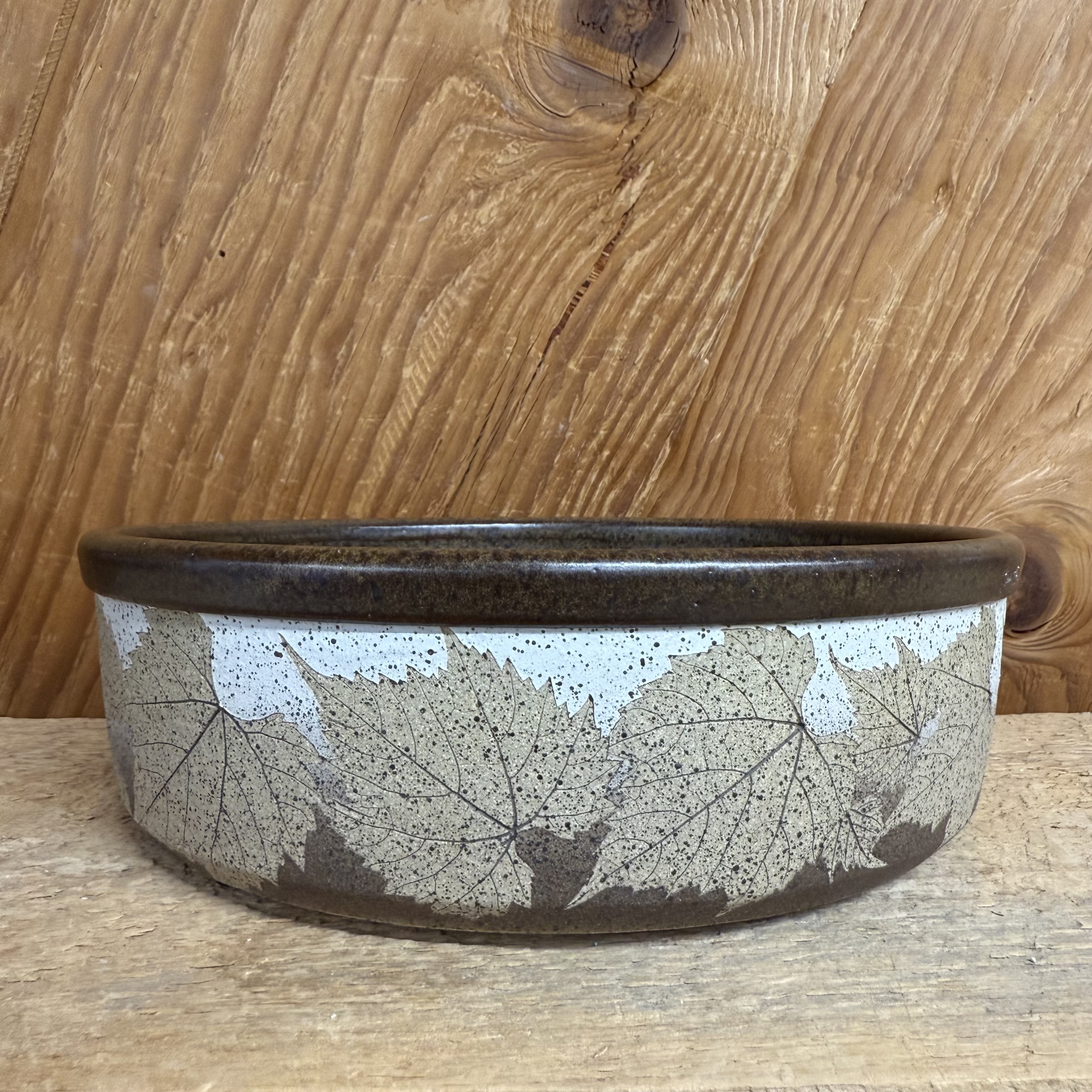 Say Congratulations and Best Wishes to Erica and David with this beautiful Bristoleaf flat bottomed serving bowl. We use real leaves on each of these. This one has grape leaves with a brown and white matte-like style on the bottom and brown glaze inside. This can be used for serving and baking. All of our pottery is lead free. Measures approx. 10 x 3″. Microwave, dishwasher, and oven safe.