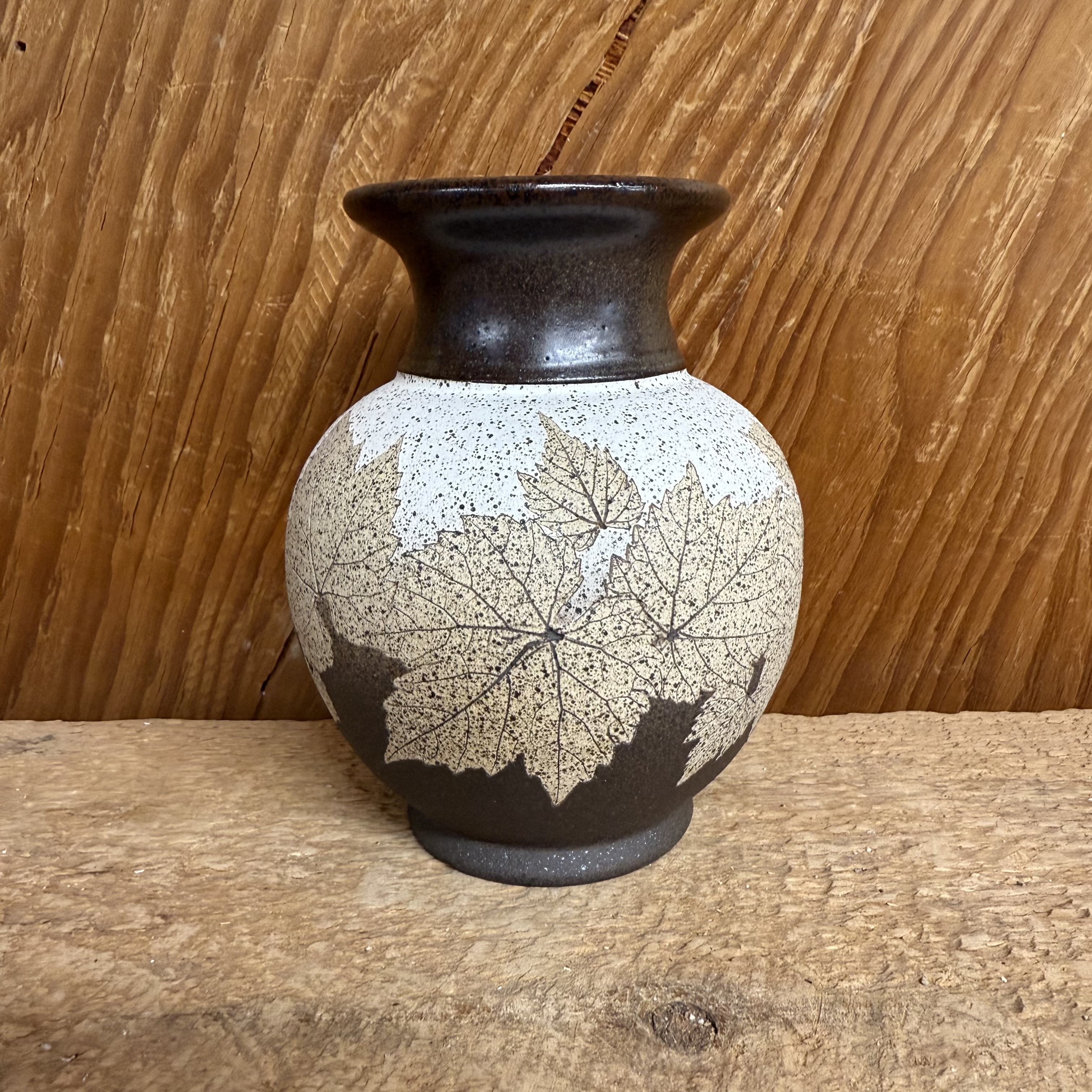 This beautiful vase is perfect for any floral arrangement. Measures approximately 4 1/2 at it’s widest and approx. 5″ tall. Decorated with tan grape leaves on a brown and white “matte-style” background, finished on top in dark brown. Leaf placement and design may vary slightly from picture.